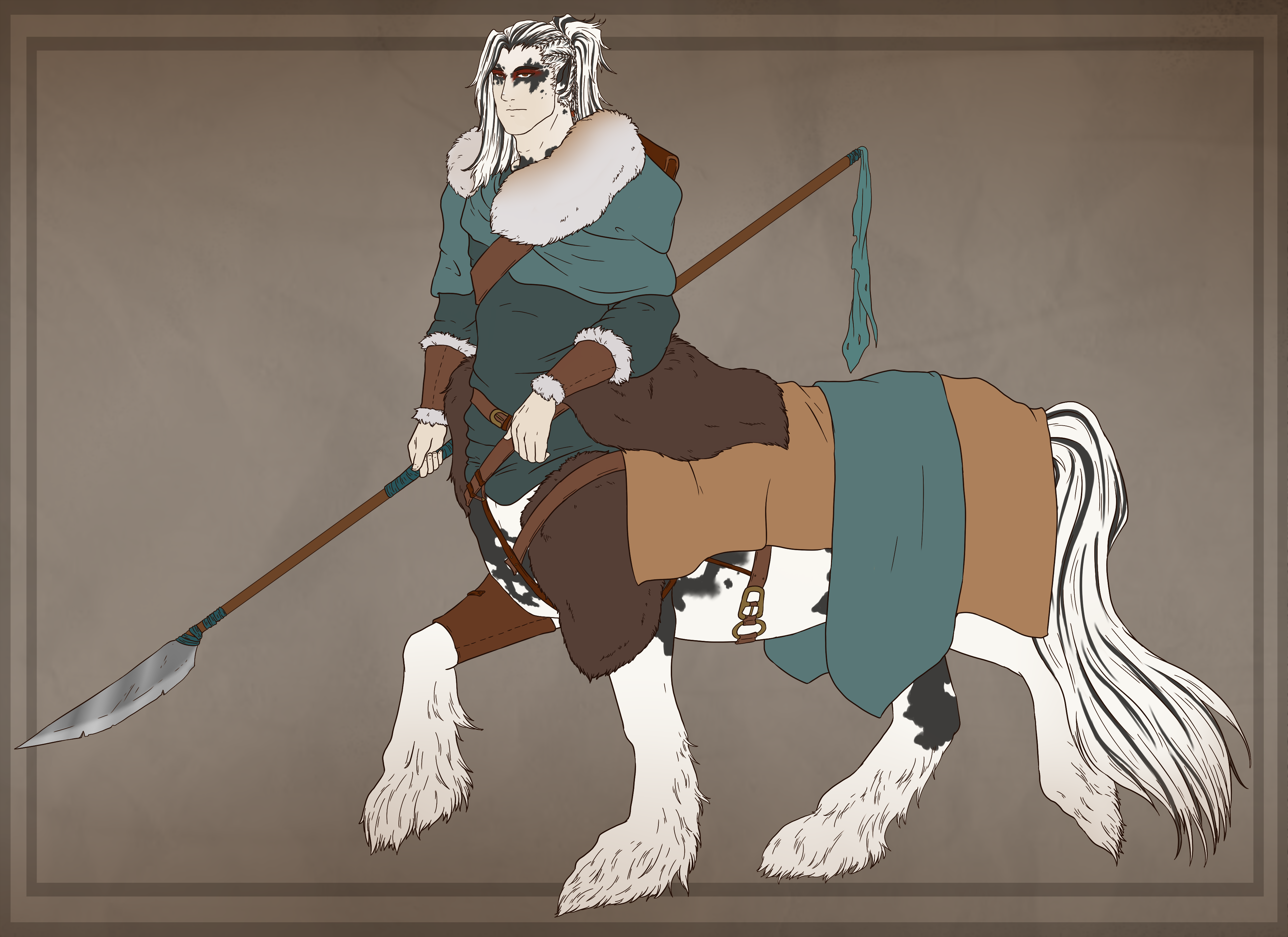 Festival of Death, like many centaurs, he will wear skeletal bodypaint. During battles, he wears red eye makeup, similar to many other warriors in the pack. His hairstyle is much more in line with styles worn by the pack than most other Centauri.