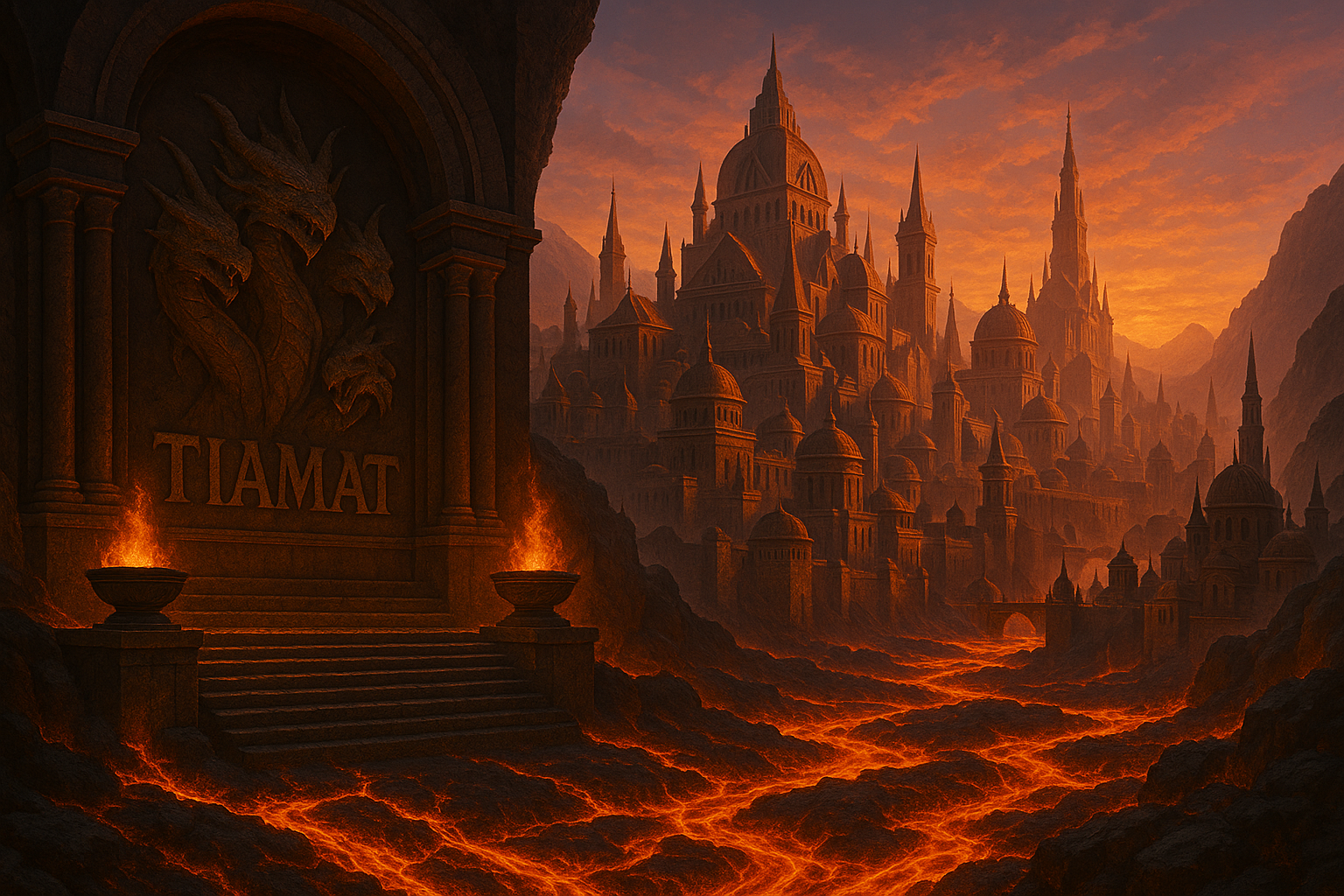The mythology of the Zilaran Empire is dominated by tales of Tiamat, the Fivefold Dragon Queen, whose creation of the world is depicted as an act of fire, fury, and domination. According to Zilaran myth, Tiamat carved the mountains with her claws, filled the deserts with her breath, and shaped the volcanic forges by plunging her tails deep into the molten earth. Dragonborn legends claim their ancestors were formed from droplets of her chromatic blood—each scale color carrying a spark of divine purpose. Kobolds tell a humbler but equally devout tale: that Tiamat scraped dust from her talons to create their race, gifting them the instincts to tunnel, craft, and support the greater draconic design. Fire Genasi believe the volcanic rivers flowing through the empire are remnants of Tiamat’s battle with the first primordials, a cosmic struggle that left behind pockets of divine flame still burning beneath the mountains.
