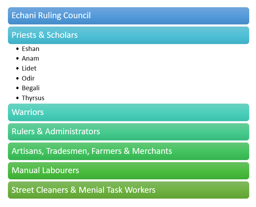 Eshan is at the top of the caste system because it's from there that the Echani Command ruled. Anam, Lidet, Odir and Begali came in second, third, fourth and fifth respectively because of the number of warriors present on the planet. Thyrsus was of the lowest caste because they differed so much from the rest of the Echani and the ruling council viewed them as inferior despite having a formidable amount of warriors.