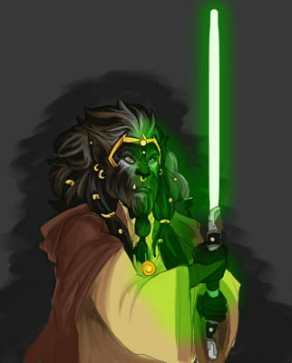 Wunnikaa was fond of the traditional Jedi robes and wore them around the temple, but she tended to shed them when training, on a mission, or in battle, as she found they got in the way of her movements. Usually, she wore a simple belt and pauldron combination made of natural fabrics, raw metals and the wood of wroshyr trees. Wunnikaa usually donned various shades of green if wearing colours other than brown.
