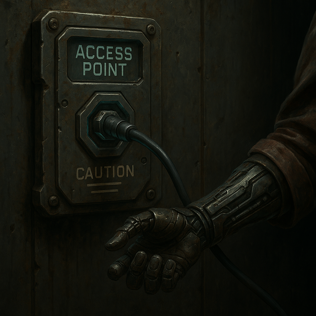 Characters with cybernetic or synthetic interfaces can jack directly into Access Points using a neural link—a retractable, high-density data cord embedded in their body. Once connected, their consciousness partially immerses into the Subnet, allowing real-time data navigation, remote activation, or intrusion attempts.