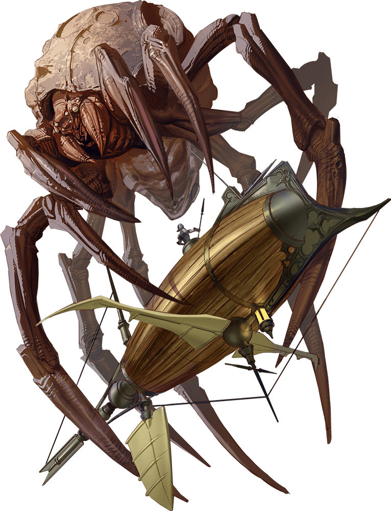 An asteroid spider has its own gravity plane and air envelope, as well as multiple spinnerets with which it can create web strands. Its living brain functions like a spelljamming helm, allowing the spider to travel through Wildspace without a ship. It often haunts asteroid belts, lurking among normal asteroids until a spelljamming ship comes close enough to be detected. The spider then snares the ship before using web strands to catch crew members and reel them toward its snapping jaws.
