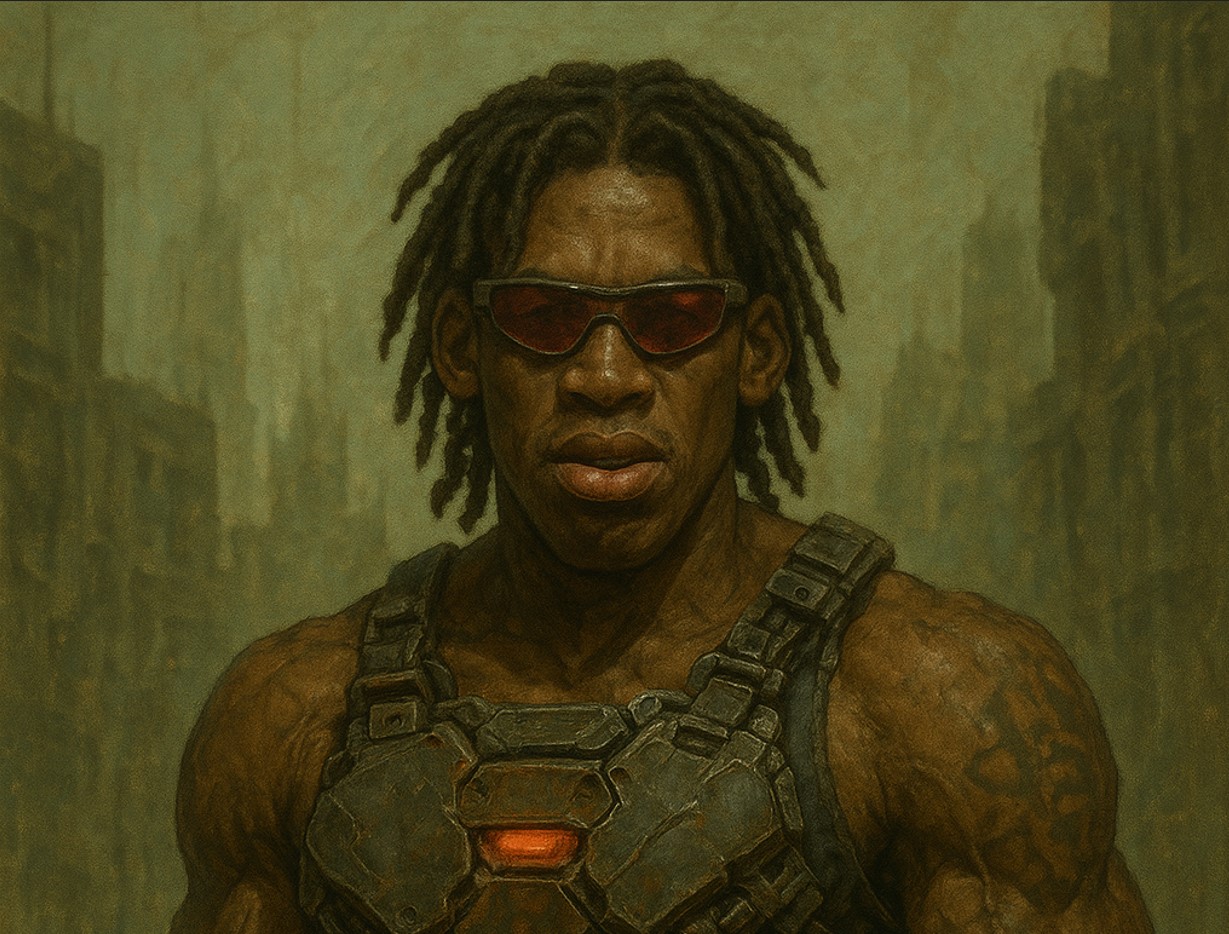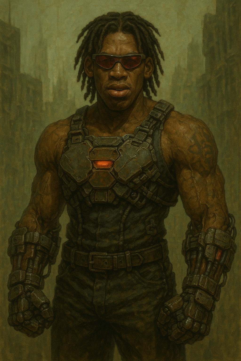 Drex Rodman, known mostly as "Rodman", is a legend among the ash-blown ruins of the Wildlands. A towering muscular Cyborg, his face can be seen on many wanted posters throughout imperial settlements. Once a pit fighter in the Imperial undercity of Kharon Prime, he vanished after a public execution was interrupted by a plasma detonation—rumored to have been orchestrated by the Borg. Now, he stalks the outer wastes, his presence heralded by the low thrum of failing servos and the crunch of boots over cracked salt and bone. He is a monster built for the pit—his dreadlocks singed at the tips, metal plates welded to his chest like patchwork armor, and his arms a brutal fusion of rusted alloy and high-torque pistons. Aetherium conduits run beneath the skin of his forearms, pulsing with every blow, giving his fists the power to crack exo-frames and pulverize armor. The knuckles are lined with reinforced striking plates—scrap-forged and blood-tempered—each blow a thunderclap of raw kinetic devastation. Rodman wears his scars and cyberware like trophies. His skin is marked with swirling tribal ink tattoos. He wears a stylish pair of cyberware glasses that protects his eyes in sandstorms. Though he is no friend to law or empire, Rodman has a crude sense of honor. He’s known to uphold his word—so long as it doesn’t come from an Inquisitor’s mouth. He’s also fiercely loyal to the Borg, whom he sees as kin: broken things reforged into weapons. To many, he’s a threat. To the Borg, he’s a saint of steel and fury.