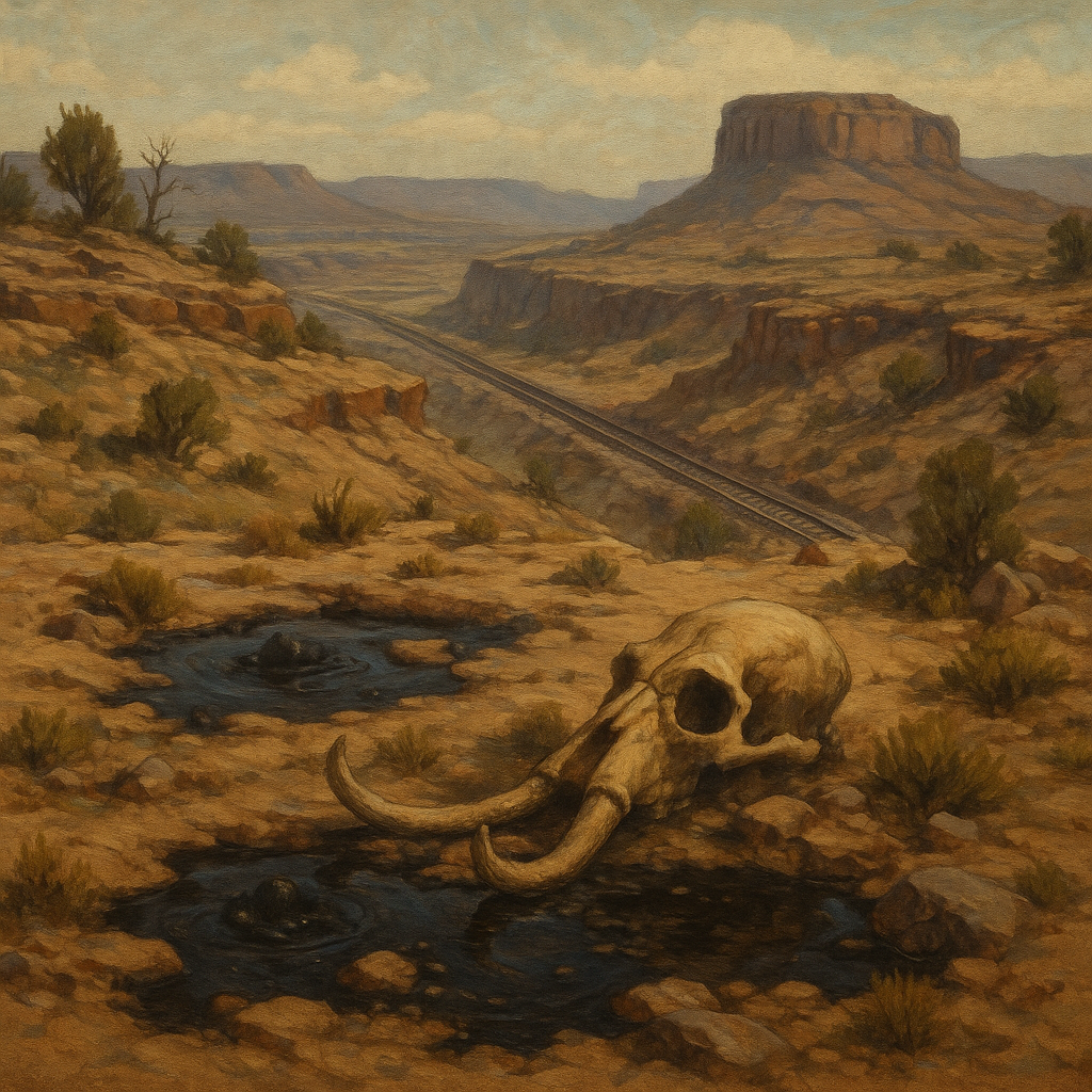 Rising like a jagged crown from the barren stretches of the Wildlands, Mastodon Ridge is a windswept mesa that overlooks the scarred rail lines leading into Brimstone Hollow. The land here is elevated and uneven, its cliffs marked by ancient erosion and carved with deep gullies that run black with old tar. Sparse clusters of wind-twisted brush cling to the red stone, while cactus blooms and cracked earth remind any traveler that water is rare, and mercy even rarer. The plateau atop the ridge is a bleak and lonely expanse—flat and broad in places, shattered and sloped in others. Bubbling tar pits shimmer under the harsh sun like pools of obsidian oil, their viscous surfaces popping with gas that smells of pitch and decay. Half-submerged in these pits lie the ancient, bleached bones of mastodons—enormous, long-dead beasts that once roamed the region before the railroads and sulfur mines cut their paths through the land. Their fossilized remains rise from the tar like the ribs of some primordial leviathan, a grim testament to the age and violence of the ridge. From this vantage, one can see for miles across the Wildlands— the rail line runs like a scar across the sand, the sulfur haze of Brimstone Hollow drifting in the far distance. Bandits, smugglers, and exiles sometimes take refuge among the rocks and gullies, using the ridge's natural height and tar-choked gullies as cover. Few dare approach without good reason—those tar pits don’t only hold the dead. They keep secrets too.