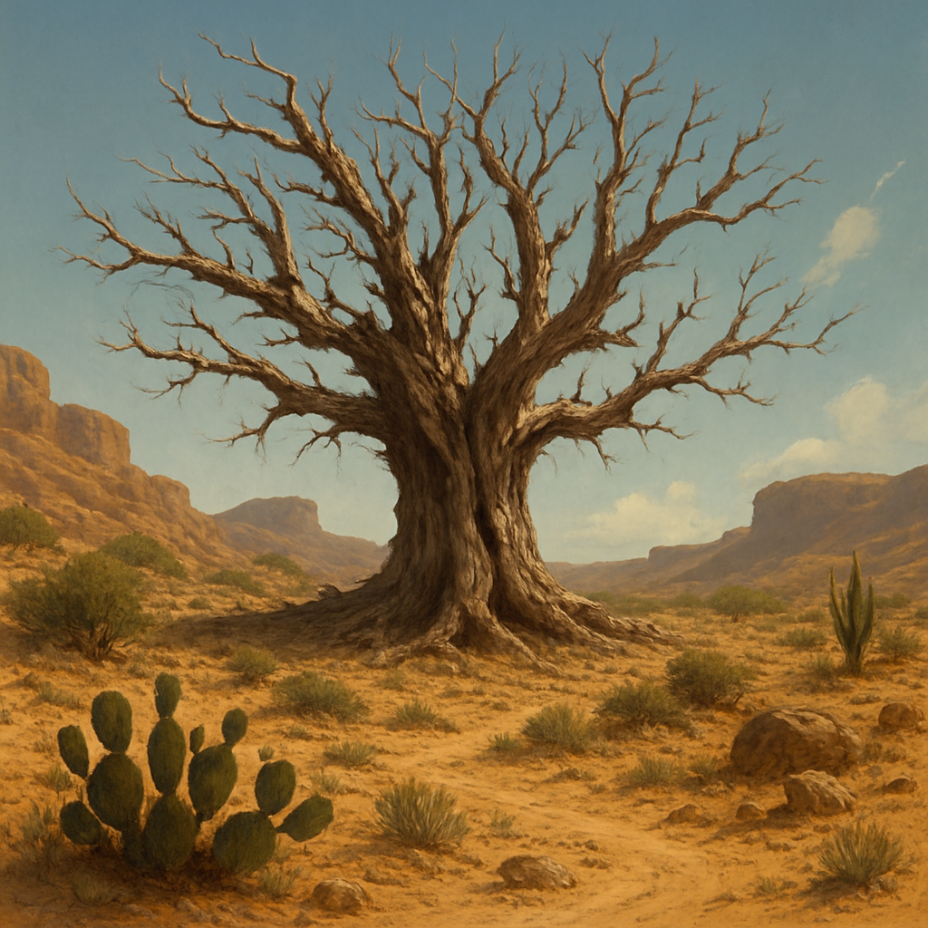 Nestled in the dusty folds of a valley just beyond Mastodon Ridge lies Methuselah Grove, a place both sacred and strange. The terrain here flattens into a shallow bowl of cracked ochre earth, ringed by sun-scorched stone and the whisper of dry wind. At its heart towers a single colossal tree—gnarled, ancient, and impossible. The Methuselah Tree. Its trunk is broad enough to house a dozen men abreast, bark darkened by time and split with silvery veins that pulse faintly under moonlight. Its roots pierce the arid soil like claws, drinking deep from whatever buried magic sustains it. The area around the Methuselah Tree is dotted with tough desert flora: bone-white shrubs, snakegrass, and thick, thorned cacti with round bulbs bearing pale pink fruit. These cacti are a rare species called Fey Buttons, and their fruit, when consumed, are said to induce vivid hallucinations. To many, the experience is little more than a vision quest—an intense and sometimes terrifying dream. But to others—those attuned to the currents of magic or with ancient blood in their veins—the fruit allows communion with the fey. Wisps of trickster spirits, long-banished dryads, and strange echoing laughter are all said to haunt the grove beneath starlight. Though the Empire has no official claim over Methuselah Grove, few dare trespass here. Locals believe it's a place where the veil is thin, where reality bends like heat shimmer, and where answers are offered only to those who dare ask the wrong questions.