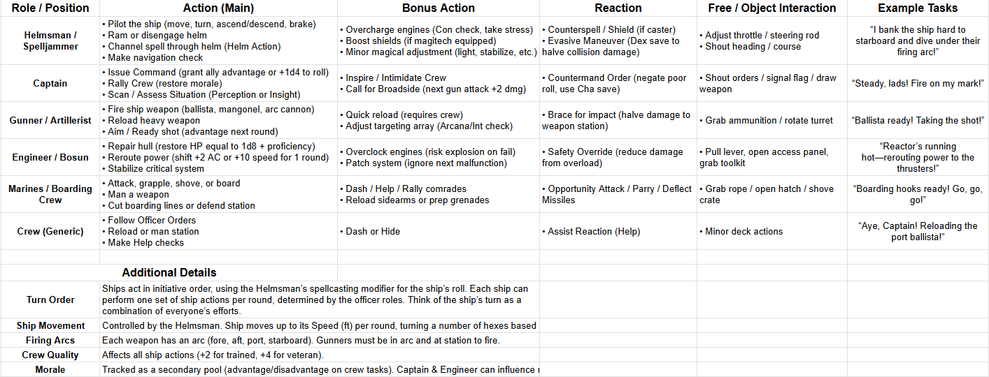 Each player takes on a unique shipboard role during Fast Travel and combat on board Spelljamming Ships or other shipboard vehicles. These roles shape your choices during space combat and hazards, giving everyone meaningful actions each round—no one is just a passenger. Each role gets special actions (once per round during combat) in addition to your regular character abilities (attacks, spells, etc.). The following is based off of homebrew mechanics, found here: Spelljammer & Multi Crew System