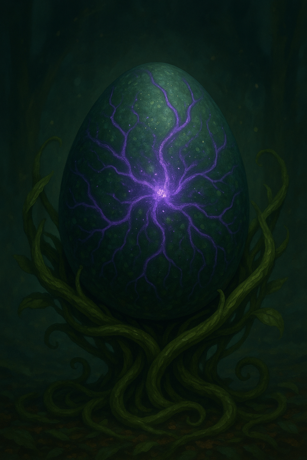 Psilofyr’s Spore is a strange, living artifact born from the Myconid Sovereign himself. At first glance it resembles an oversized egg, but its surface is textured like a mushroom cap - dotted with small nodules and faint fungal growths. Beneath its skin, glowing green veins pulse in slow, rhythmic patterns, as though something inside is breathing. It radiates a gentle warmth when held, and every so often the veins brighten in response to touch or movement, almost as if the Spore is aware of its surroundings. A faint hum resonates from within, too low to be heard clearly but felt deep in the bones. Laurel describes it as a seed of transformation - neither wholly benevolent nor destructive on its own. Its purpose depends entirely on how it is used. It feels delicate, yet carries a sense of ancient power - a gift, a burden, and a promise all at once.