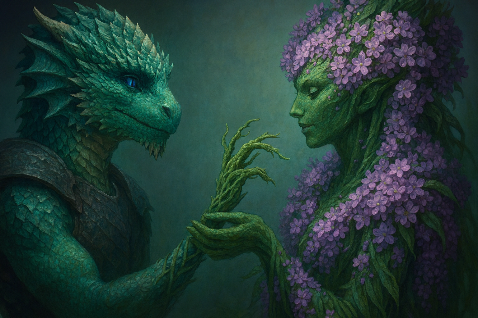 Upon entering the Fey Wild, they were greeted by a procession of Fey singing ancient songs of magic and heading to a grove in the North. There they met Laurel, the Lilac Queen, the Archfey who rules of this region of the Feywild, known as the Lilac Court. She entreats the party to share with her their stories, taking exceptional interested in Frostwarden, referring to him as the "arbiter of the first songs". She also felt empathetic for Kell Saleur, whom she had recognized as a peaceful Druid, and from her fey magic she granted him a hand made of vines to replace the one he had lost long ago.