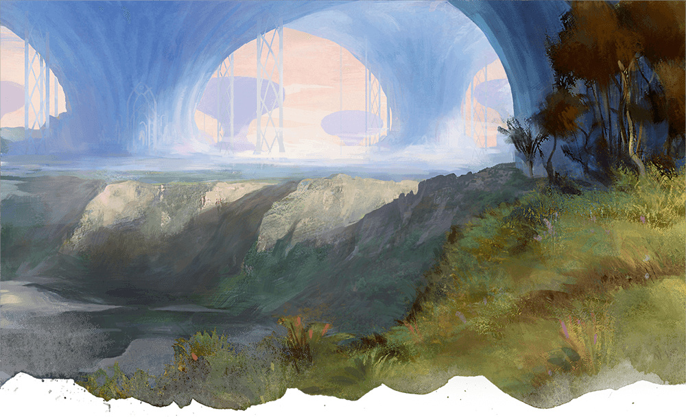The day and night cycle of mimicked that of the Material Plane, a crystal blue sky with a golden sun above the trees in the day and a white moon amongst a river of stars on the warm nights. Arvandor's unpredictable weather might manifest as sudden squalls beating the paths with heavy winds, leaving sunny arcs of warm light filtering down from above minutes after it passed. There was seemingly always the faint sound music in the distance, as often the playing of instruments as the tune of wind curling through the holes in the trees.