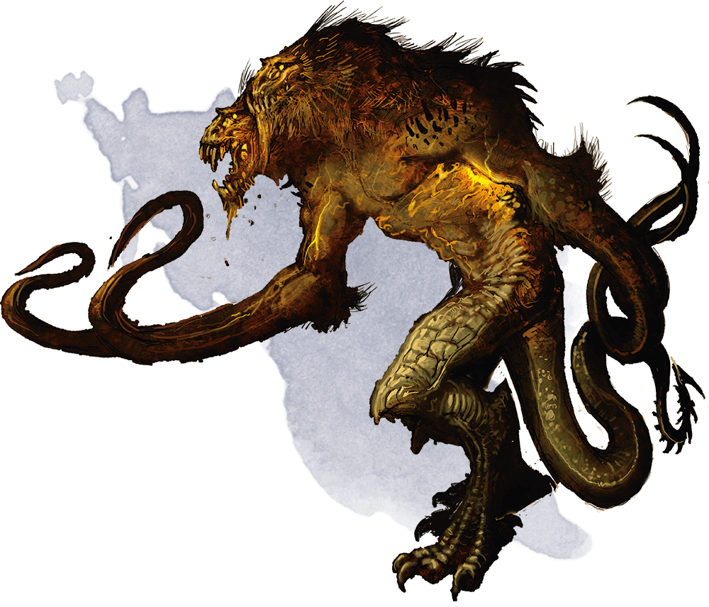 Demogorgon towered a full 18 feet (5.5 meters) in height, his body at once sinuous like that of a snake and powerful like that of a great ape. Two baleful baboon heads, with blue and red faces similar to those of mandrills, leered from atop his lumbering shoulders, from which two long tentacles writhed. His lower torso was saurian, like some great reptile with blue-green, scaly skin. He had an immense forked tail.