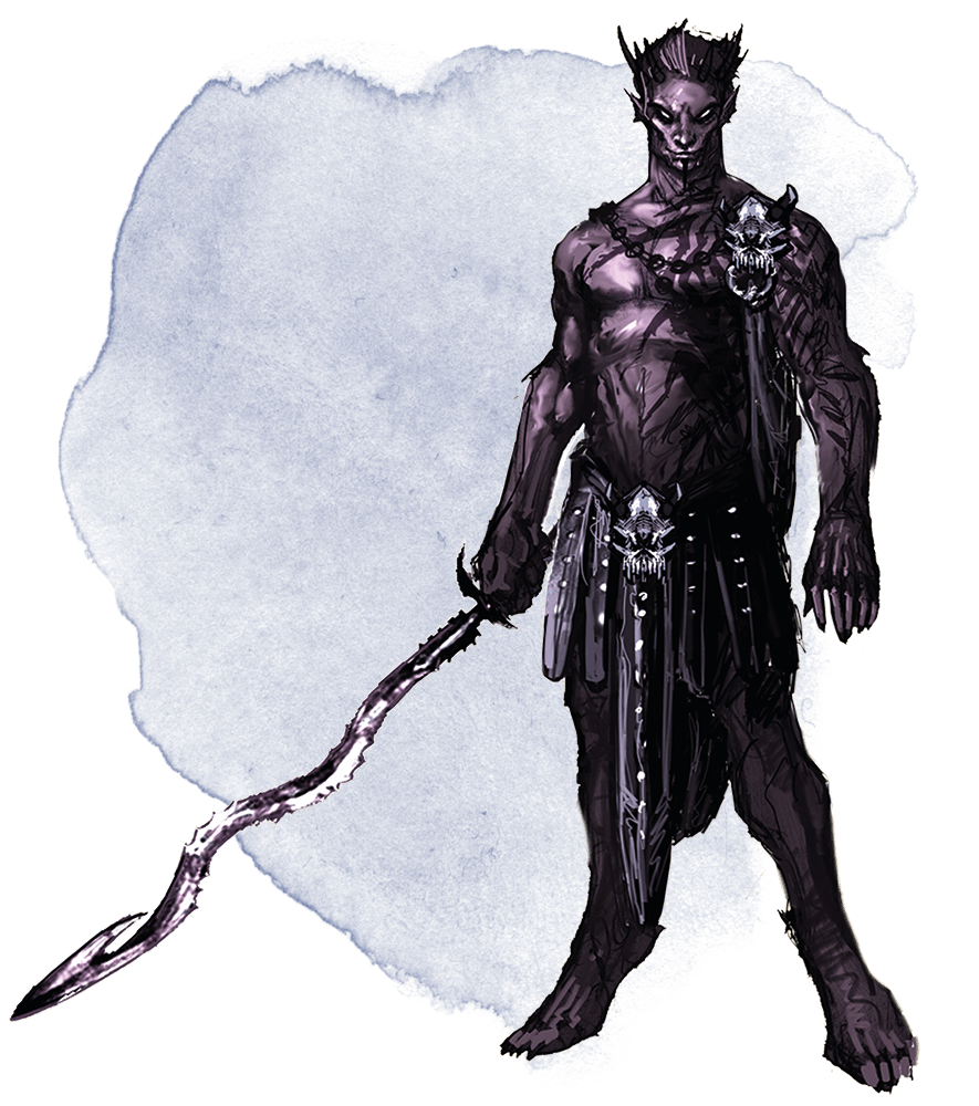 Standing 9 feet (2.7 meters) tall, Graz'zt appeared as a lithe, muscular large humanoid. His skin shone like polished obsidian and his eyes glittered with malevolent green light. He had yellowed fangs, pointed ears, and six slender fingers decorating each hand. He was sometimes described as having six small black horns half-hidden amid his thick black hair. These fiendish traits were apparent, regardless of whatever form Graz'zt chose to take. He was considered the comeliest demon in the Abyss, and dressed in the most expensive and elegant finery on the entire plane.