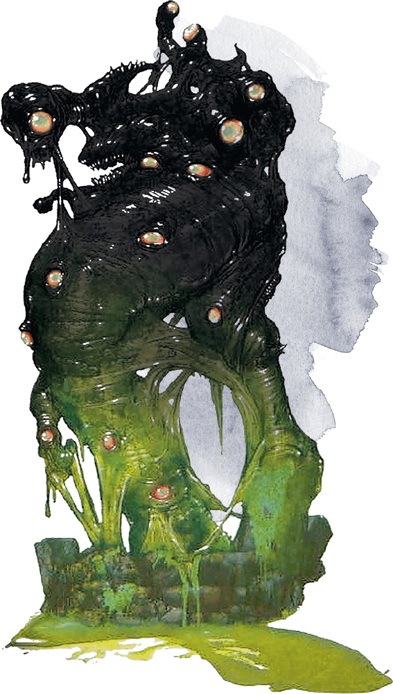 The amorphous mass was swirled and striated with a hideous mixture of hues, primarily streaks of black and green combined with bilious browns and yellows as well as translucent greys and ambers. Caustic slime of the same colouration was constantly secreted from the sludge-spewing horror, and it was known to weep tears of encrusting black grime from the glaring red eyes that pulsated and shifted across it, peering in all directions.