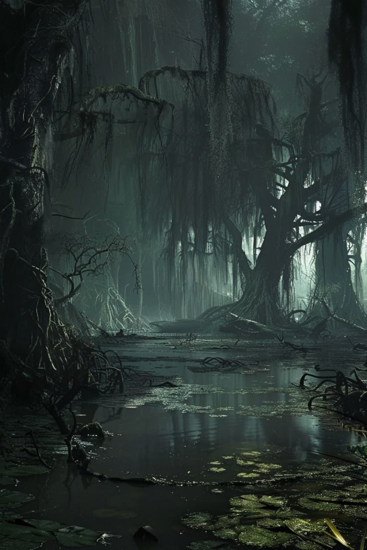 A maze of half-submerged trees, their roots rising like twisted fingers from the water. The air hums with insects, and the shadows move wrong. It’s said that the deeper you go, the more the trees begin to watch you.