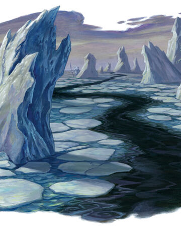 The fifth layer of the Nine Hells is a freezing realm of ice within which cold flames burn. A frozen sea surrounds the layer, and its gloomy sky crackles with lightning.