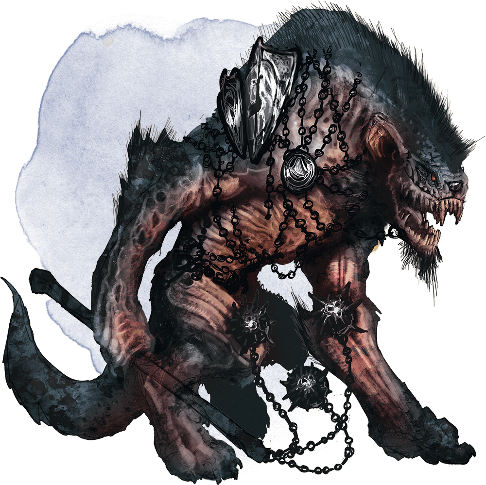 Despite being able to conjure his mighty flail at will, he was just as likely to wade into battle with nothing but his fearsome fangs. He was well known for the use of fear and invisibility magic, as well as bestial transformations. His strong sense of smell and sharp perception made him an expert and dangerous tracker. If placed in serious danger, he could teleport away in order to plot another day and later amass a force necessary to take revenge.