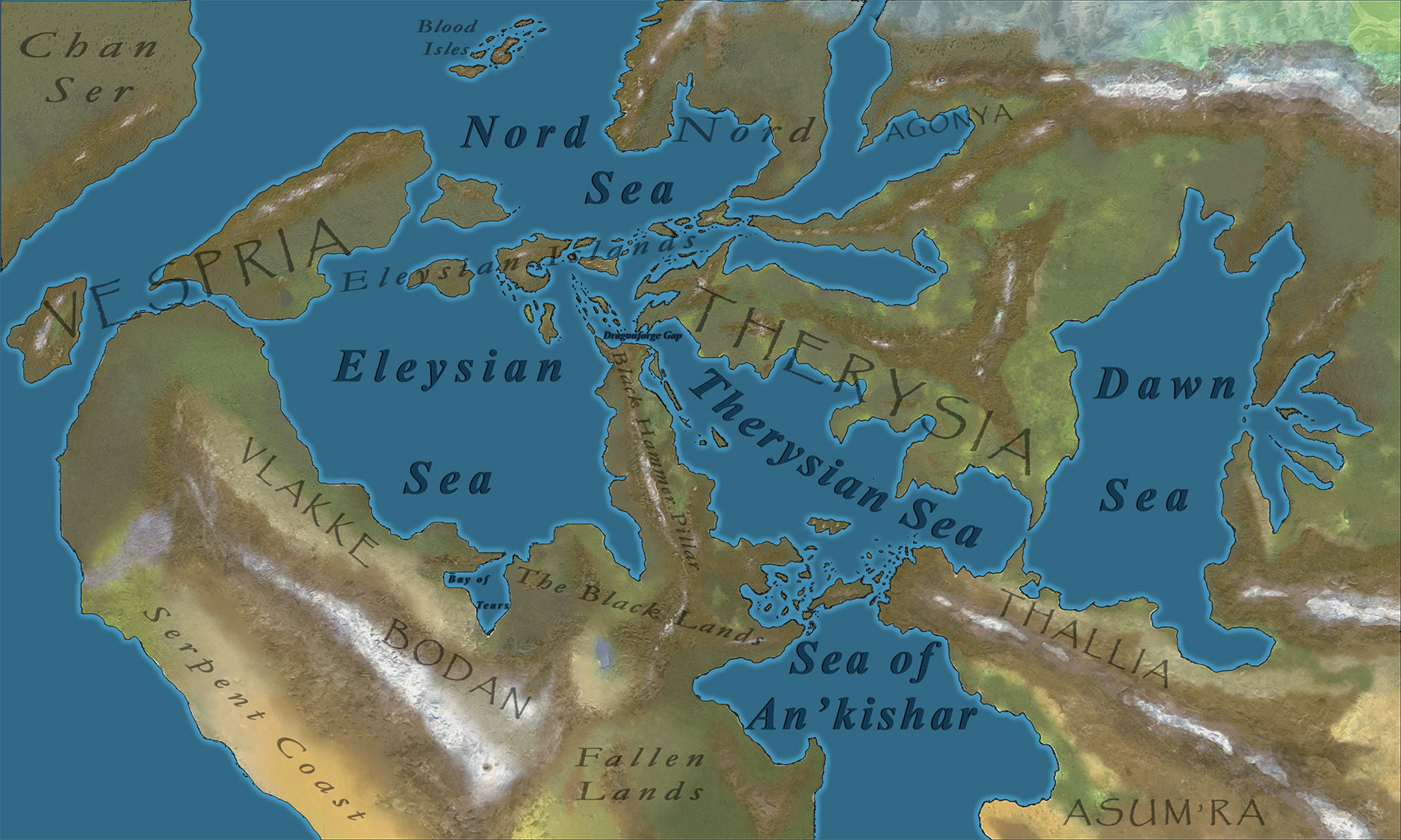 (tehr-EE-zshun)True to its namesake, the capricious Sister of the Sea, the Therysian Sea is a tempest in a bottle. It is a convergence zone of powerful currents, where cold waters from the Nord Sea clash with warmer streams from the south. The result is a perpetually rough and stormy sea, a constant challenge for the sailors who call it home. Its most infamous passage is the treacherous Dragonforge Gap, a narrow strait of churning water and contrary winds that connects the Therysian and Eleysian Seas. The gap is formed between the Dragon's Hammer peninsula to the north and the Silverstrand Shore, the flat face of the Black Anvil region, to the south.