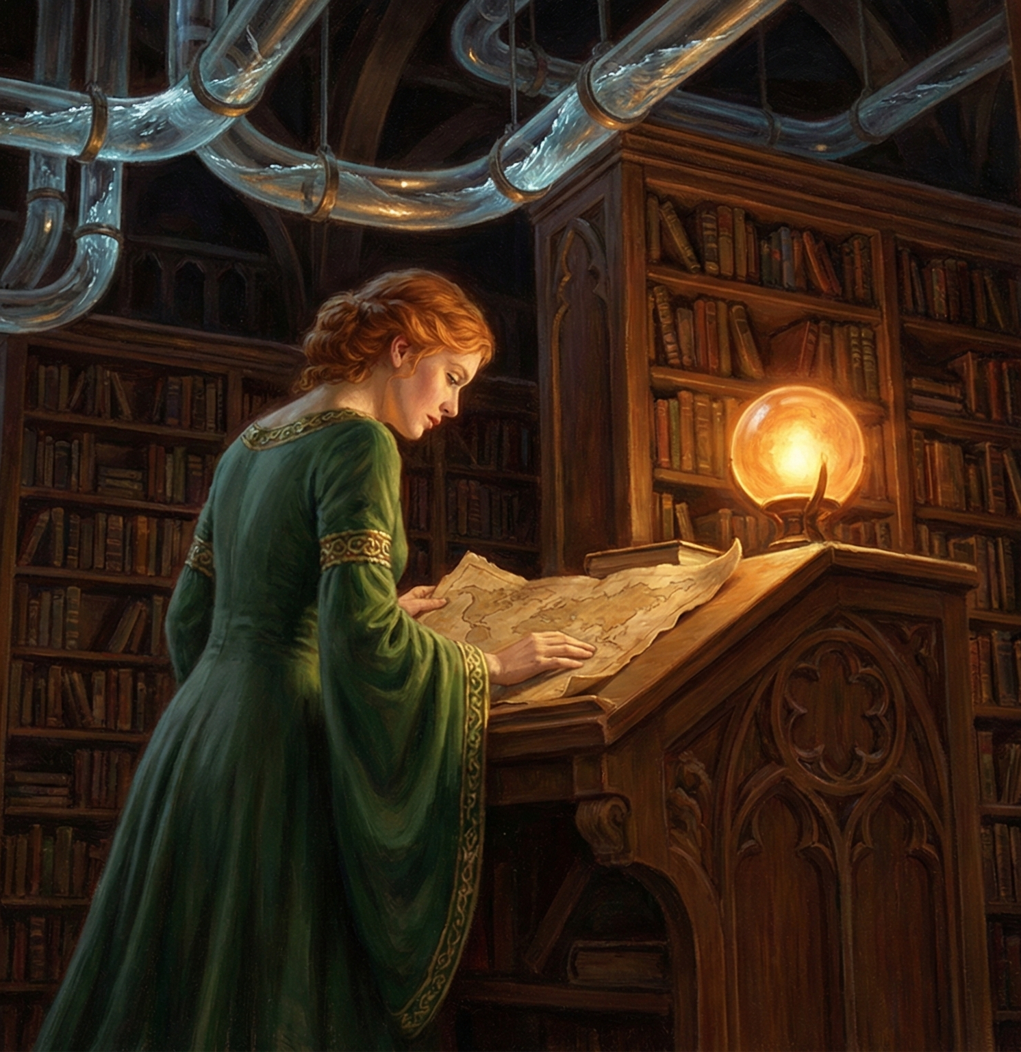 The Omnium that emerged from my effort to imagine it from Krysaalis’s perspective became more than a library, morphing into a museum of natural law. Krysaalis begins her journey in the Wing of Tides, a section of the archive dedicated to the study of water and navigation. I spent hours working out how Vespria preserves water-damaged texts using 'Harmonic Suspension.' The piping exists to provide water to keep the humidity at exactly the right level to protect the written works, not just as a convenient form of pleasant white-noise.While much of that technical detail remains in the notes (for now), it informs the texture of the scene. The world is older and deeper than the characters walking through it.