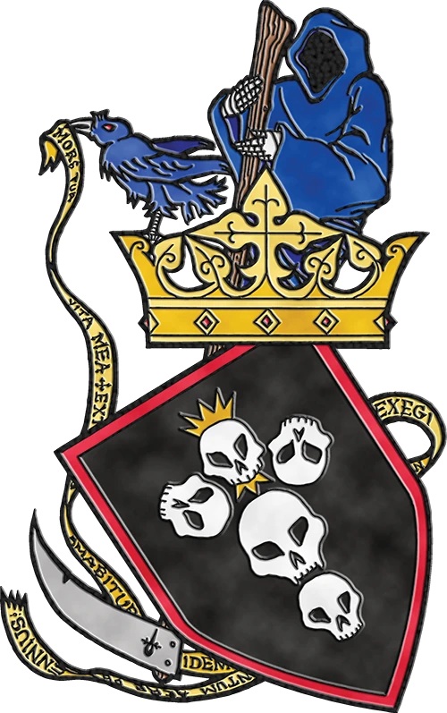 - Die lateinischen Begriffe auf dem Wappen des Clans werden großteils vom Schild selbst verdeckt, doch lassen sich als die folgenden Sätze entziffern: