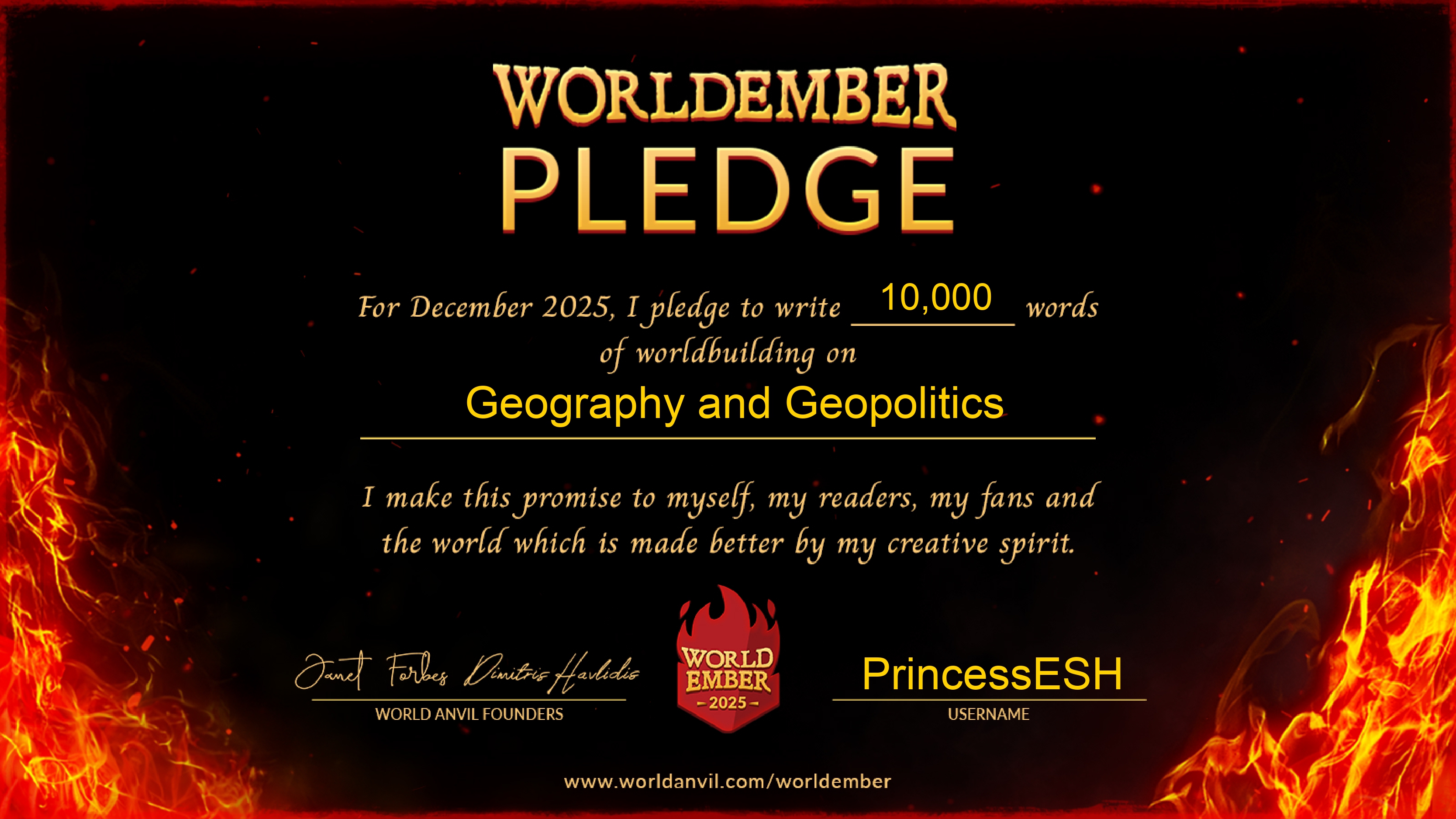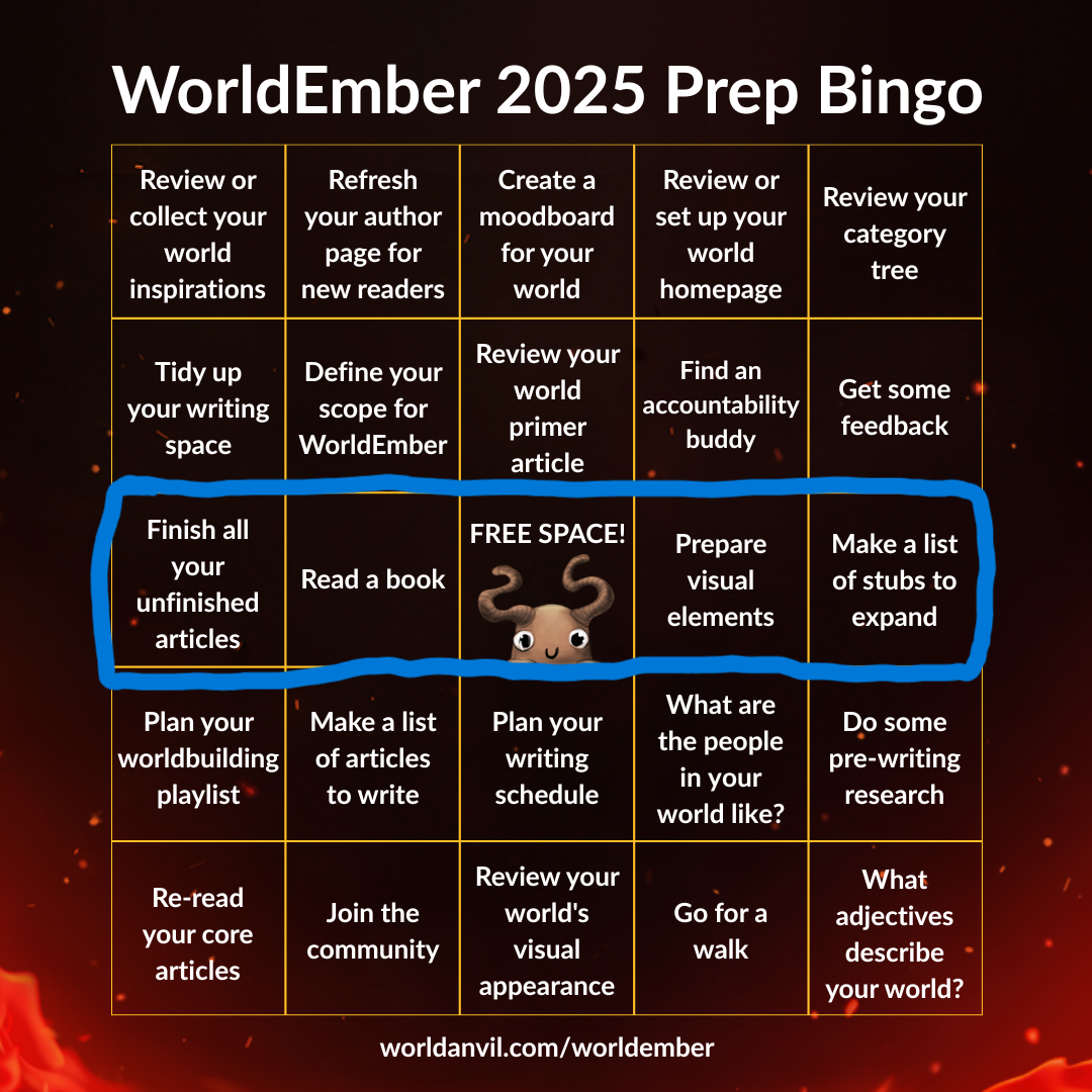 In an attempt to not completely burn myself out, I will be preparing for WorldEmber by selecting five homework prompts from the WorldEmber bingo: