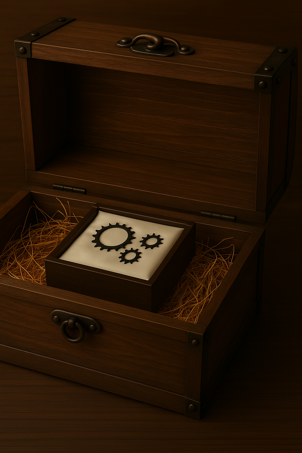 Po dokonaniu tego odkrycia Farciarz ponownie włamał się do pokoju Kaelena, wykradł klucz, zegar i zwój i poszedł otworzyć warsztat Thalora - tym razem udało mu się wejść do środka, po krótkim przeszukaniu pokojów arcymaga znalazł skrzynkę zawierającą 1000 sztuk złota (oraz trochę więcej złotych monet w części sklepowej warsztatu) oraz schemat techniczny zegarka z trzema strzałkami wskazującymi na różne jego elementy opisanymi imionami - korpus z imieniem Kaelen, zębatki z imieniem Dave oraz szkło ochronne z imieniem Lysander. Schemat ten nakłonił towarzyszy do otwarcia skrzyni którą przywieźli z granicy (po uprzednim namówieniu Radymira by odebrał sobie przytomność poprzez rzucenie czaru wykrycia magii w pomieszczeniu w którym wcześniej rzucono potężny rytuał) - znaleźli w niej trzy małe, czarne zębatki pasujące do zegarka.