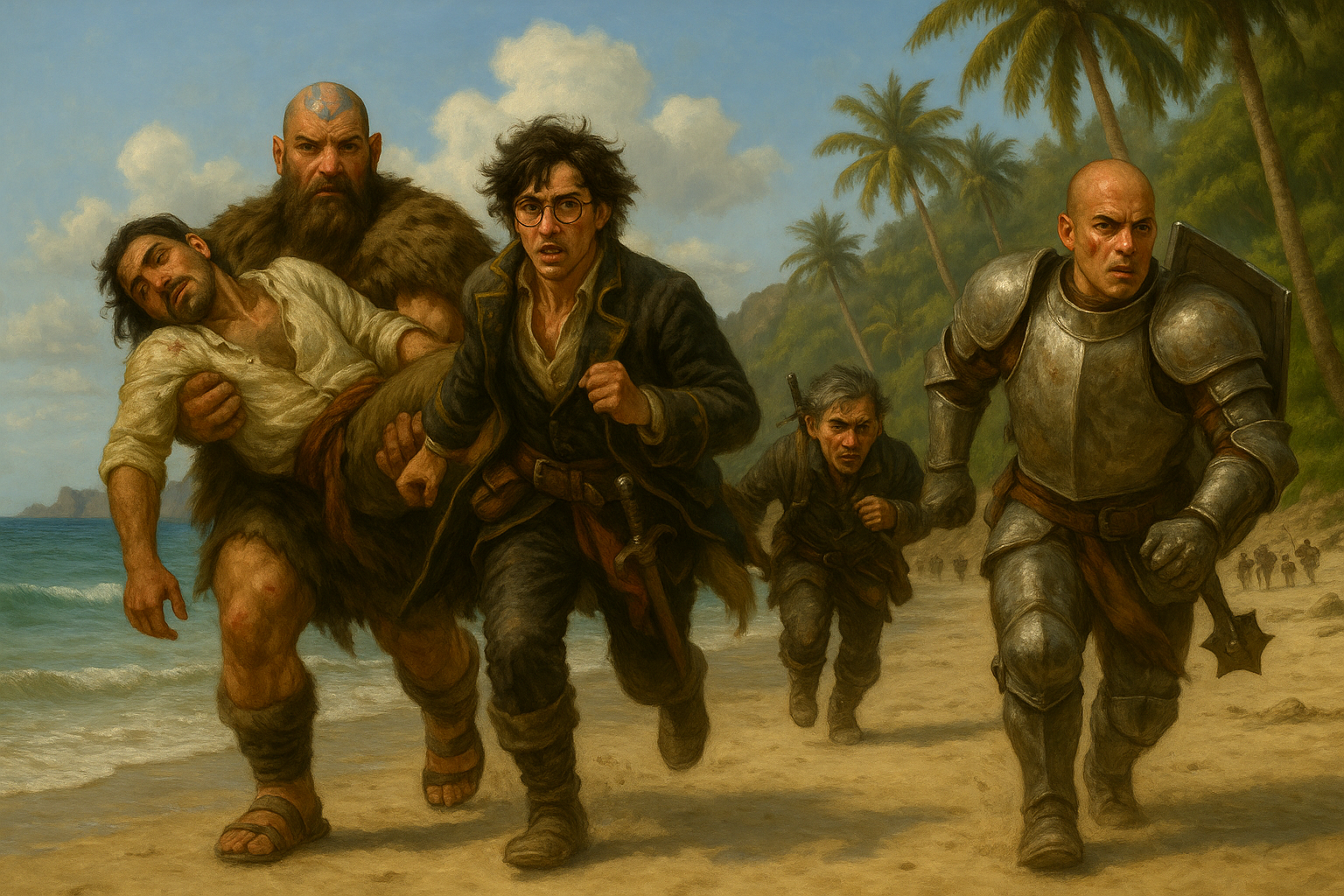Po zebraniu zaopatrzenia i załadowaniu wozu z końmi na statek drużyna wyruszyła w podróż w kierunku wyspy ze skarbami oznaczonej na mapie skradzionej kilka dni wcześniej przez Farciarza.W trakcie pięciu dni dość spokojnej podróży morskiej Asvard miał możliwość wykazać się jako doświadczony żeglarz, który odnajduje się w roli kapitana. Syrena Północy wieczorem piątego dnia podróży odnalazła na morzu wyspę, gdzie na brzegu wzniesiona była niewielka, drewniana osada. Towarzysze postanowili opłynąć wyspę i zakotwiczyć statek w bezpiecznej odległości od osady, następnie wsiedli na łódź i wylądowali na brzegu. Po ukryciu łodzi pośród drzew wybrali się w stronę osady piaszczystym brzegiem, z którego wyskoczył cztery wielkie skorpiony, które omal nie powaliły Radymira - trzy z nich zginęły w walce, zaś czwarty uciekł z powrotem w piach pod wpływem magii Dave'a. Drużyna po szybkim opatrzeniu ran ruszyła z powrotem w stronę palisad oddzielających osadę od reszty wyspy.