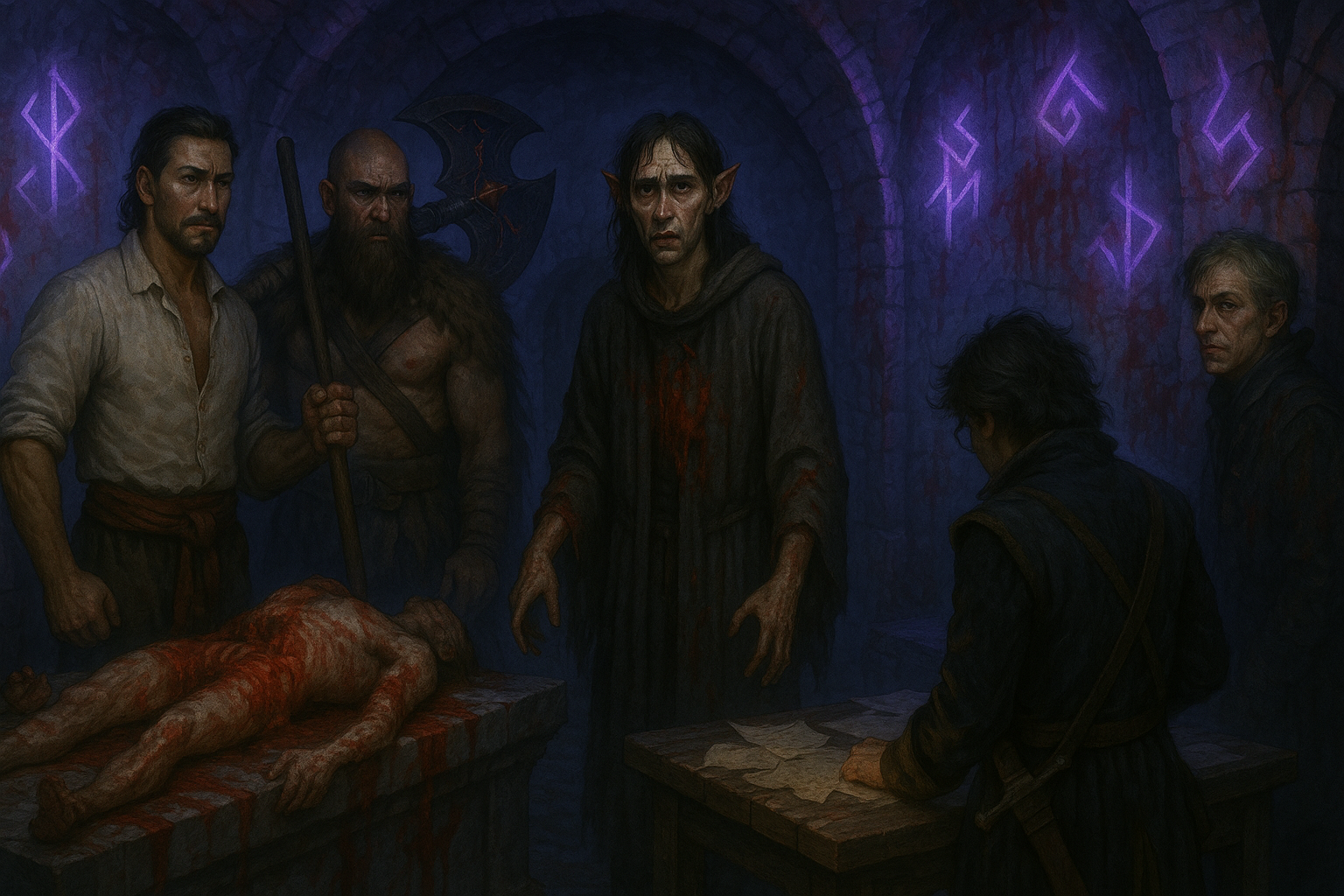 Pomieszczenie, w którym uwięziony był Morathil ewidentnie służyło do prowadzenia badań oraz rytuałów eksperymentalnych - na to pierwsze wskazywała ilość zwojów z chaotycznymi zapiskami, z których udało się odczytać krótką notatkę stanowiącą fragment dziennika badacza, zaś na to drugie niewielki ołtarz pokryty nieznanymi runami oraz w miarę świeżą krwią i liczne ludzkie szczątki.