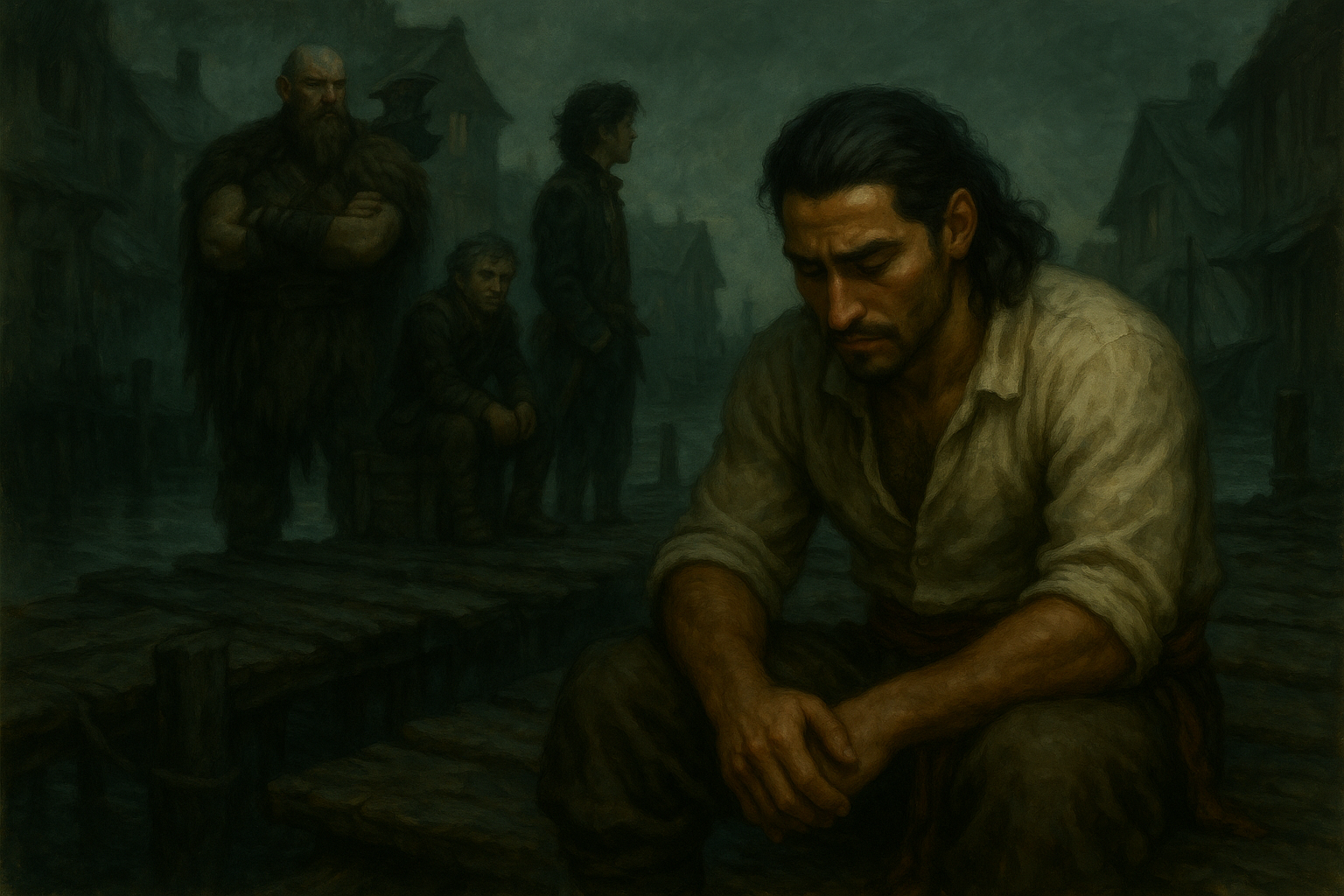 Chłodny wiatr z północy przygnał nad portowe miasto mgłę gęstą i lepką, co nadało niemal opuszczonemu miastu upiornego wyrazu - widząc widok podniszczonego, opustoszałego portu kapitan Asvard był bliski zawrócenia statku na południe, jednak widok pojedynczej przystani w dobrym stanie skłonił go do zacumowania w porcie. Dave, Abdul i Asvard opuścili statek i wyruszyli w miasto w poszukiwaniu żywej duszy - pierwszą napotkaną była starsza kobieta, która niosła do domu wiadro z wodą. Staruszka, wdzięczna za pomoc w dźwiganiu ciężaru, chętnie odpowiadała na pytania i wspomniała, że widziała karawanę z Akath, która przybyła do miasta około miesiąca wcześniej i wyruszyła na południę szlakiem do Trzech Wiatrów. Zaprosiła towarzyszy do domu i poczęstowała ich zupą mówiąc jednocześnie o burmistrzu pijaku oraz o regularnym przeładunku w porcie - przystań, do której zacumowała Syrena Północy co miesiąc odwiedzana jest przez statek z południa, z którego do magazynu obok wyładowywane są skrzynie odbierane przez statek z północy następnego dnia. Dave podziękował staruszce za informację, wręczył jej złotą monetę i wraz z pozostałymi wrócił do portu by "przeparkować" statek. Następnie wraz z Morathilem wybrali się do tawerny "Łzawy Żuraw" - ostatniego przybytku tego typu otwartego w tym mieście, zaś Farciarz opuścił pokład by śledzić dziecko, które z portowego nabrzeża pokazywało ojcu statek. Szedł tak za nimi do ich domu i był o krok od wejścia do środka, jednak zmienił zdanie i wrócił na Syrenę - w tym czasie Lesiu i Gniewko skorzystali z chwili gdy nie byli pilnowani i uciekli ze statku, nadal mając w głowie obraz Janika rozsmarowanego po pokładzie.