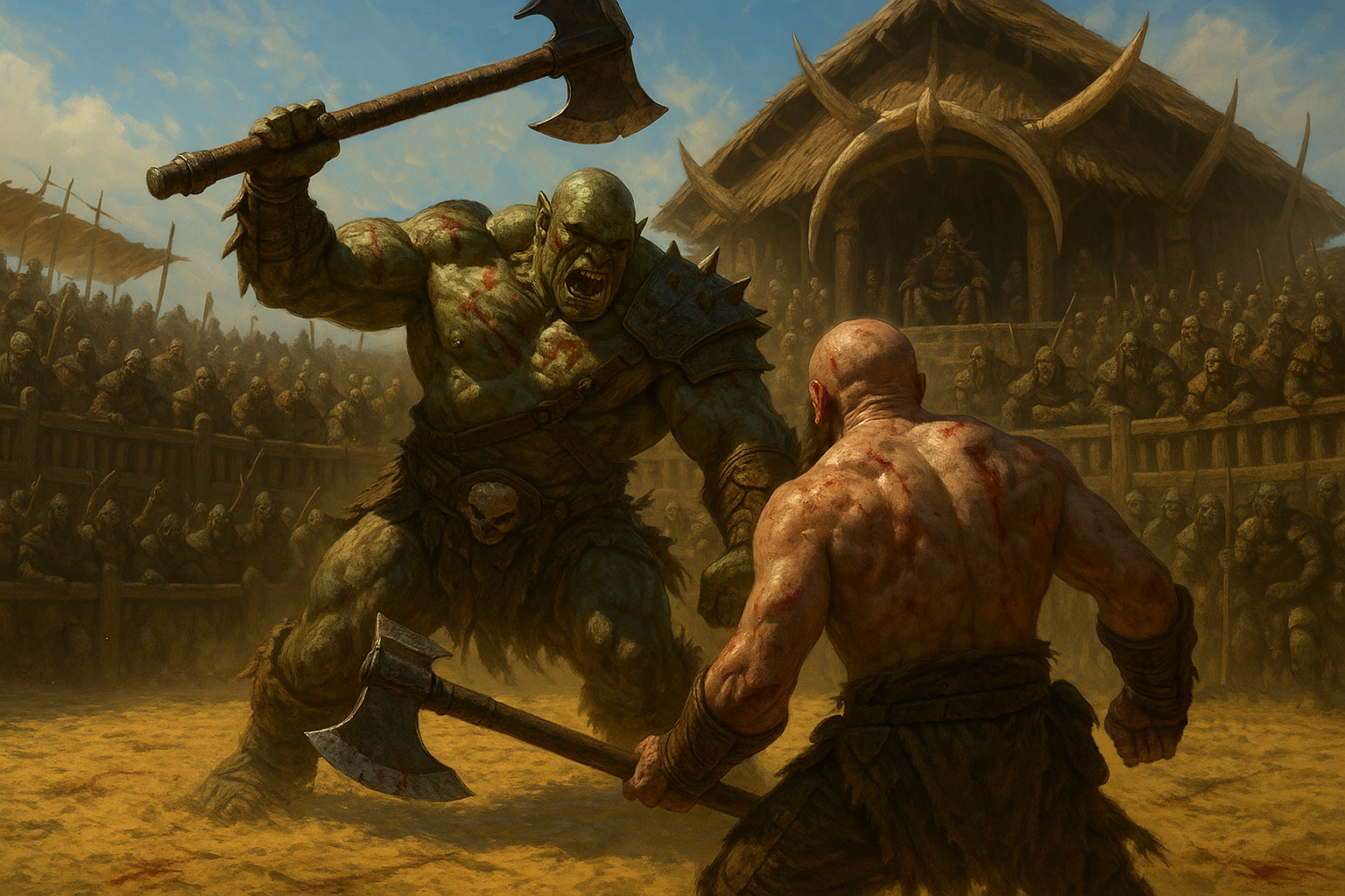 Pierwszej krwi posmakował topór Asvarda, który mimo (a może z powodu) większej powagi sytuacji tym razem lepiej radził sobie z unikaniem ciosów przeciwnika oraz zadawaniem własnych. Zgodnie z tradycją pojedynku do ostatniej krwi nikt nie stosował magii mającej wpłynąć na przebieg pojedynku, co nie przeszkodziło Dave'owi we wznoszeniu inspirujących okrzyków otuchy w stronę Asvarda oraz obelg pod adresem Urghaka. Po około minucie walki obaj czempioni byli już mocno ranni i zmęczeni, aż w końcu Asvard ostatkiem sił wbił topór w brzuch orka by za chwilę go wyszarpać i szybkim ruchem odrąbać mu głowę wygrywając pojedynek w iście honorowym stylu. Z trybun rozległ się krótki okrzyk szoku, który natychmiast przerodził się w radość ze zwycięstwa - najwidoczniej widowni nie robiło różnicy kto wygrał dopóki dostali wystarczająco ekscytujący spektakl. Wódz Gorthak wstał ze swojego tronu, podszedł do truchła swego syna i klękając obok odprawił za niego szeptem krótką modlitwę. Następnie sięgnął po leżący obok Krwawy Zew i z okrzykiem "HONOROWO, MULU MULU" wręczył go Asvardowi czym naznaczył go jako godnego podróżowania przez Rubież. Po tym geście, wśród wrzasków wznoszących się z orkowych gardeł towarzysze zostali skierowani do wyjścia z obozu - drogą tę przemierzali pod eskortą doradców wodza oraz strażników, przez co ponownie nie mieli możliwości pomóc Kaelenowi, który patrzył jak jego ostatnia nadzieja w postaci triumfujących bohaterów znika w tłumie.