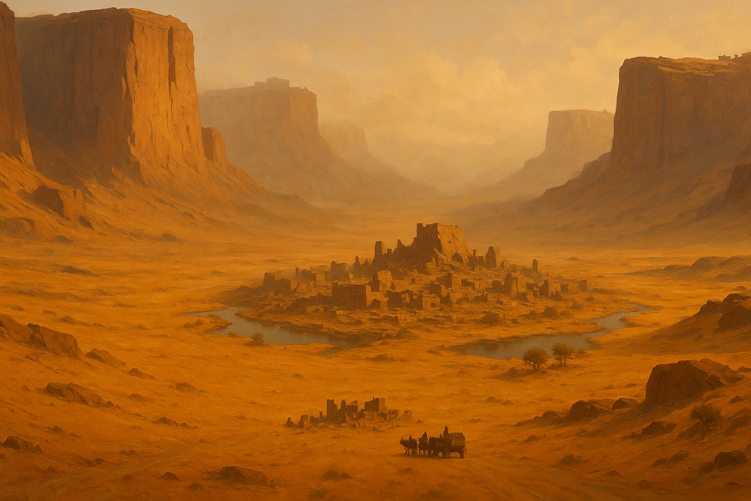Kolejny dzień w palącym słońcu oznaczał podróż w stronę ludzkich zabudowań, które towarzysze mijali wcześniej w drodze do obozowiska orków. Po dwóch godzinach drogi przesmyk pomiędzy skalnymi formacjami rozszerzył się w równinę, której centralną część stanowiły starożytne, niemal całkowicie zniszczone przez warunki atmosferyczne i czas ruiny otoczone podłużnymi, półokrągłymi jeziorami.