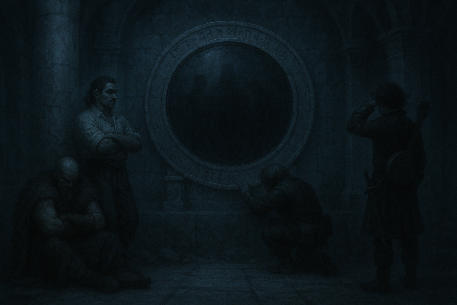 Za nimi towarzysze znaleźli niemal puste, ascetyczne pomieszczenie wyzbyte wszelkich dekoracji - jedyne co zwróciło ich uwagę to wielkie, obsydianowe lustro w którym zamiast zwykłego odbicia z daleka widoczne były niewyraźne sylwetki postaci. Na górnej części obramowania lustra widoczny był napis Ten niesie światło, kto ujawni swe cienie. Do tafli lustra jako pierwszy zbliżył się Asvard, który po chwili zbladł i odszedł na bok. Dave, Abdul i Farciarz również spojrzeli w odbicie i zamilkli będąc w szoku spowodowanym tym, co ujrzeli - każdy z nich zobaczył bowiem wizję swojej największej traumy. Długą, ciężką ciszę przerwał w końcu Abdul, który jako pierwszy zdecydował się podzielić z towarzyszami tym co widział, co zachęciło pozostałych członków drużyny do podobnych zwierzeń.