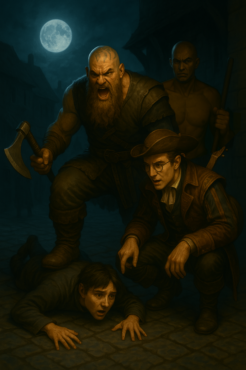 Krótką dyskusję która zawiązała się między towarzyszami przerwało spotrzeżenie młodego chłopaka, który zdawał się dość nieudolnie ich śledzić. Gdy zorientował się, że został dostrzeżony rzucił się do najkrótszej ucieczki w swoim życiu - została ona bowiem natychmiast przerwana gdy Abdul krokiem przez cień znalazł się przed nim. Asvard i Kuzo również podbiegli do chłopaka i zaciągnęli go w zaciszne miejsce, Kuzo z pomocą Abdula znalazł zaułek za krzakami i postawił tam sferę Leomunda, gdzie przy użyciu znanych technik perswazji (przyciśnięcia nogą do ziemi oraz zapoznanie dzieciaka z Krwawym Zewem) dowiedzieli się, że chłopak nazywa się Gerwazy, jest świeżym rekrutem w straży Warowni i został wysłany przez sierżanta Darwyna by śledzić drużynę i zdawać raport na temat ich poczynań. Gerwazy nie znał jednak motywacji swojego dowódcy i nie był w stanie powiedzieć dlaczego dostał taki rozkaz. Po zakończeniu przesłuchania towarzysze zdecydowali, że zamiast pozbywać się świadka zaproponują mu dołączenie do załogi Syreny Północy na co wystraszony dzieciak się zgodził.