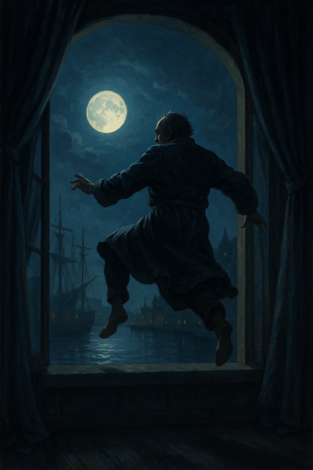Farciarz tknięty przeczuciem przyjrzał się dokładnie półce z książkami i zauważył, że została zamontowana na szynie. Powoli i ostrożnie przesunął półkę, za którą ukazała się ciasna, ukryta sypialnia z pojedynczym łóżkiem w którym również spał hrabia oraz dużym oknem wychodzącym na zatokę w miejscu, w którym od zewnątrz żadnego okna nie było widać. Niziołek widząc tę scenę zawahał się czy dokonać mordu (a jeśli tak to na kim dokładnie) - w tym czasie kolejne chrapnięcie pierwszego hrabiego obudziło tego drugiego. Ten zerwał się na nogi i widząc otwarte wejście do komnaty podszedł do okna. Następnie powoli skierował się w stronę przejścia do głównej sypialni nie widząc Farciarza pozostającego pod wpływem czaru niewidzialności. Po chwili jednak do nosa hrabiego dotarł zapach ścieków, którymi pokryty był łotrzyk po pobycie w kanałach - czując go hrabia natychmiast się odwrócił i wyskoczył przez okno w ciemną noc.