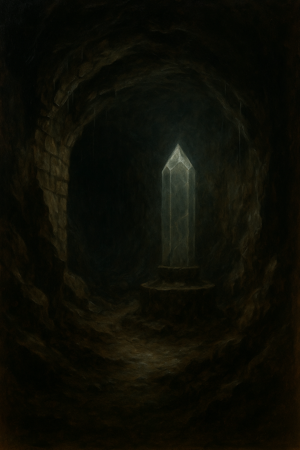 Tak poinformowani towarzysze postanowili przeprowadzić zwiad w okolicach częsci wylotowej kanalizacji z zamku. Kratę zabezpieczającą wylot pokonali dzięki polimorfii z Farciarzem schowanym do przenośnej torby, zaś kolejną kratę u ujścia następnej rury kanalizacyjnej pokonali w jeszcze sprytniejszy sposób - Farciarz wskoczył z powrotem do torby, Kuzo przełożył ręce przez kraty i tam wypuścił niziołka. Na odchodne ten otrzymał czar niewidzialności i powoli rozpoczął wędrówkę wgłąb rury. Po kilku metrach w połowie zakrętu magia czaru niewidzialności stała się niestabilna - Farciarz zauważył, że w miejscu gdzie się to dzieje znajdują się ukryte drzwiczki, które po otwarciu prowadziły do niewielkiej groty wydrążonej w skale, wewnątrz której znajdował się wysoki kryształ emitujący pole antymagii. Łotrzyk zbliżył się do niego i postanowił go dezaktywować poprzez wysunięcie go ze skalnej misy w której był osadzony. Następnie wrócił do Kuzo by poprosić o odświeżenie wygasłej magii niewidzialności i skierował się z powrotem wgłąb kanalizacji