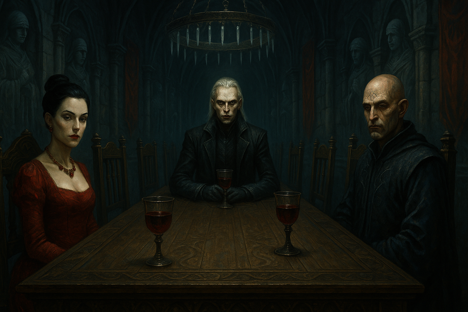 Spektakl "Ku Ciemności"Po chwili aktorzy skierowali swe kroki do wyjścia i gestem zaprosili drużynę do podążania za nimi w kierunku Wieży Spokoju, gdzie miała odbyć się wieczerza powitalna. Drużyna zaskoczona zaproszeniem postanowiła podążać za aktorami w towarzystwie eskorty wampirów, którzy dołączyli do orszaku. Już po kilku minutach spaceru w trakcie którego Kuzo w tłumie dojrzał przerażoną Elarię bezgłośnie wymawiającą słowo UCIEKAJCIE przed bohaterami jawiło się wejście do wysokiej, ciemnej wieży pozbawionej okien a przed nim długi szpaler powitalny z kilkunastu osób po obu stronach kłaniających im się gdy ich mijali. Towarzysze z sercami w gardłach przekroczyli próg budynku i weszli po schodach na trzecie piętro, gdzie czekali już na nich sześciu wampirzych strażników oraz gospodarze - dwójka starych wampirów w niezwykle eleganckich szatach oraz człowiek w ciemnych szatach z symbolem Caldariusa wyrytym na czole siedzieli przy długim, dębowym stole na którym zamiast jedzenia stały tylko kielichy i dzbany z ciemną cieczą.