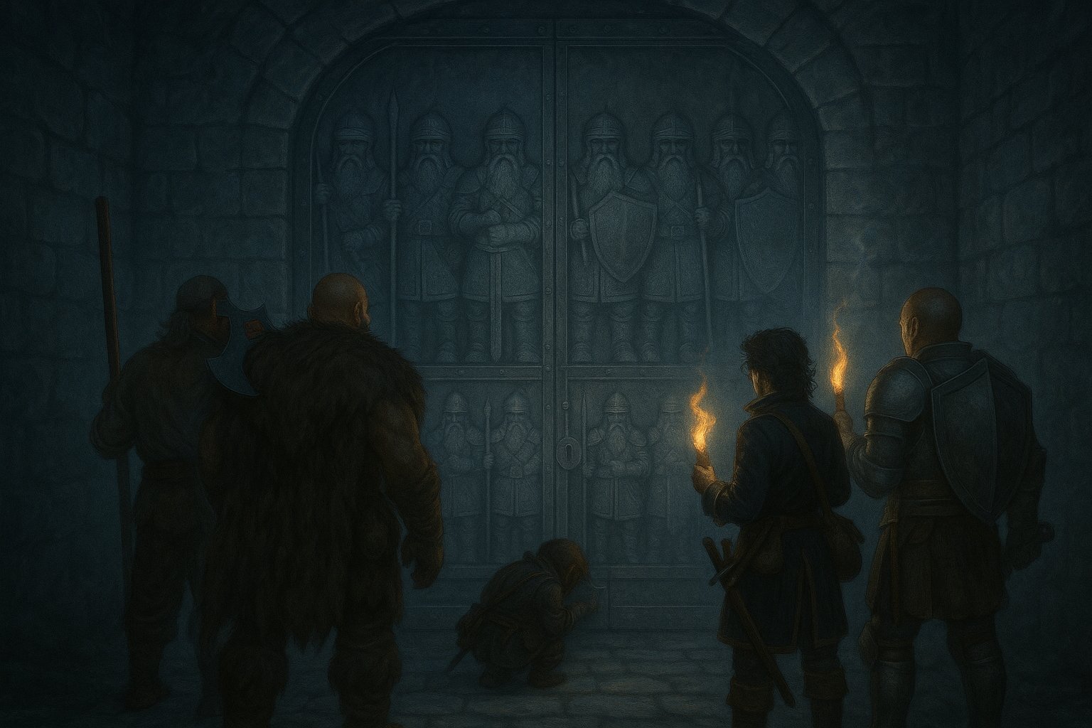 Rankiem tuż po pobudce towarzyszy odwiedził Thrain w towarzystwie dwóch krasnoludzkich szamanów i gdy bohaterowie zebrali swój sprzęt zaprowadzili ich ciemnym, wąskim korytarzem do ogromnego, sześciokątnego wgłębienia w skale wewnątrz którego skrywała się kamienna płyta gęsto pokryta krasnoludzkimi runami stanowiącymi formę ostrzeżenia oraz zapieczętowania tego, co znajdowało się po drugiej stronie. Thrain skinął głową na towarzyszących mu szamanów, którzy rozpoczęli rytuał otwarcia przejścia, będący w istocie trwającą godzinę modlitwą-prośbą kierowaną do masywu górskiego by to sama skała otworzyła przejście. Gdy prośby zostały wysłuchane towarzysze przecisnęli się przez świeżo powstałą szczelinę i zeszli po schodach kilkaset metrów w dół czując w powietrzu chłód, wilgoć i tajemnice. Na dole czekał na nich widok zawalonego wejścia w kształcie krasnoludzkiej głowy do którego prowadził most nad płytkim strumieniem - towarzysze po chwili siłowania się ze skałą postanowili zejść do wody i eksplorować naturalne jaskinie odbiegające od części lochu wydrążonej przez krasnoludy. Wkrótce natrafili na krąg teleportacyjny składający się z pokrytych runami menhirów, który Kuzo pobieżnie obejrzał i stwierdził, że stanowi on bramę wyjściową a następnie skierowali się do wąskiej szczeliny w skale gdzie za krętym korytarzem znaleźli zgniłe, pokryte czarnym nalotem zwłoki krasnoluda należącego do jednej z wcześniejszych ekspedycji. Asvard wrzucił zwłoki do swojej torby przenośnej, zaś Abdul sprawdził dalszą część korytarza i idąc za smrodem zgnilizny trafił na jamę, której większą część zajmowała mętna sadzawka. Mnich zanurzył stopę w wodzie, z której natychmiast wynurzył się dwugłowy beholder który zaczął razić drużynę różnokolorowymi promieniami emitowanymi przez macki na jego ciele - nie zrobiło to jednak wrażenia na towarzyszach, którzy szybko uporali się z wynaturzeniem i już wkrótce przeszukali dokładnie jaskinię znajdując w wodzie trzy krasnoludzkie nieśmiertelniki.