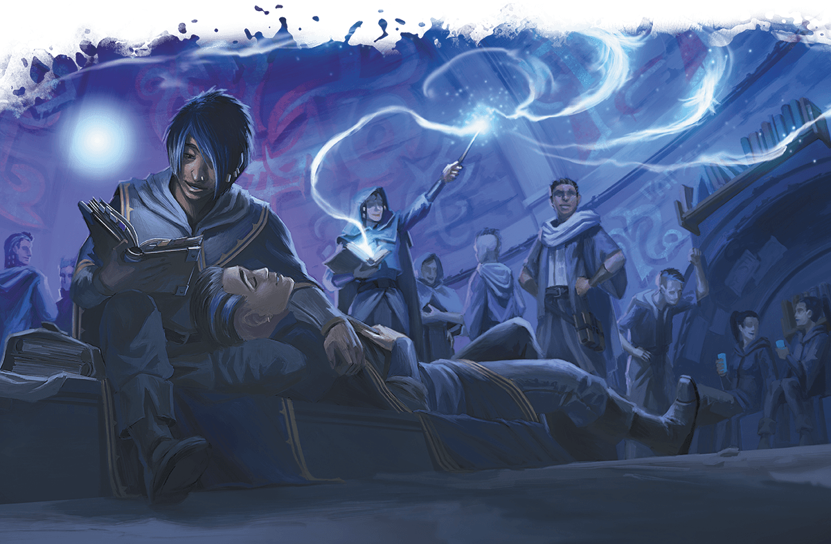 Magic of the book-that's what many folk call wizardry. The name is apt, given how much time wizards spend poring over tomes and penning theories about the nature of magic. It's rare to see wizards traveling without books and scrolls sprouting from their bags, and a wizard would go to great lengths to plumb an archive of ancient knowledge.