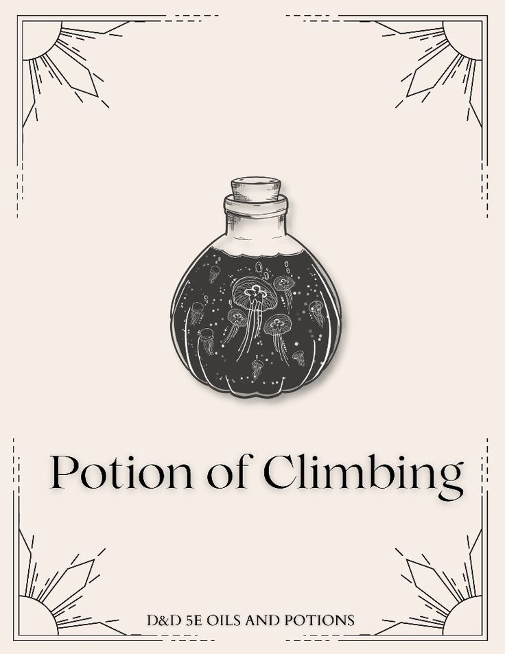 When you drink this potion, you gain a climbing speed equal to your walking speed for 1 hour. During this time, you have advantage on Strength (Athletics) checks you make to climb. The potion is separated into brown, silver, and gray layers resembling bands of stone. Shaking the bottle fails to mix the colors.