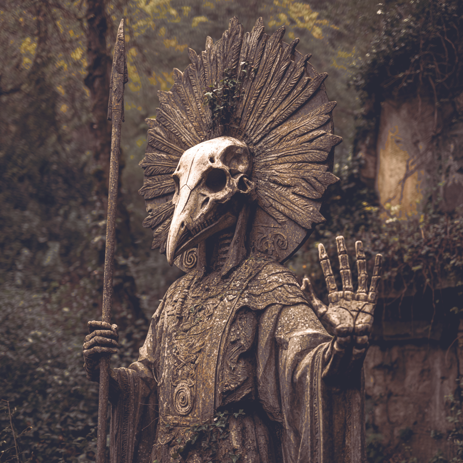The ruins are hidden within dense and tangled evergreen forest on the sunside of shores of Tokaru. The area of the ruins covers roughly five square kilometers of the forest, and the perimeter is well marked by a ring of imposing volcanic statues of Kofa, the vulture-headed goddess of death. Each statue stands with its back to the ruins with one arm outstretched in warning.