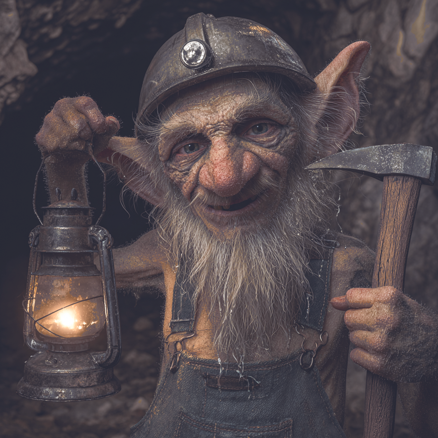 An old goblin, with a wild white beard. His wiry arms have a strength which belies his stature. He walks bare foot, with a shuffle, hunched over and using his pick axe as a walking stick, while holding his lantern in front of him. He wears old dusty overalls made from a rough fabric. Atop his head he wears a simple cap of iron, dented and pitted with age.