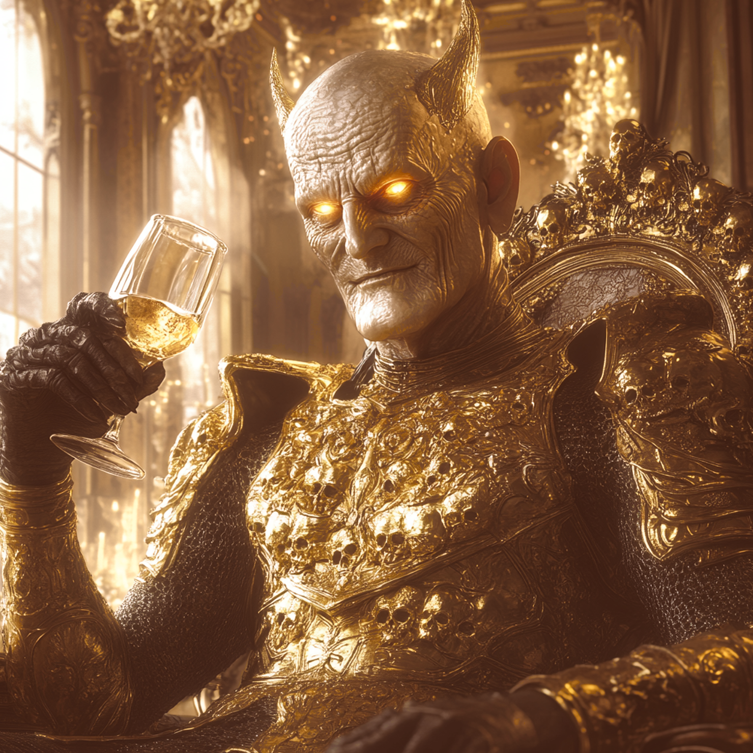 Malius' horns are atypically small compared to most Fire Lords and their Devilkin descendants. His skin looks like polished gold and his eyes glow pure white.