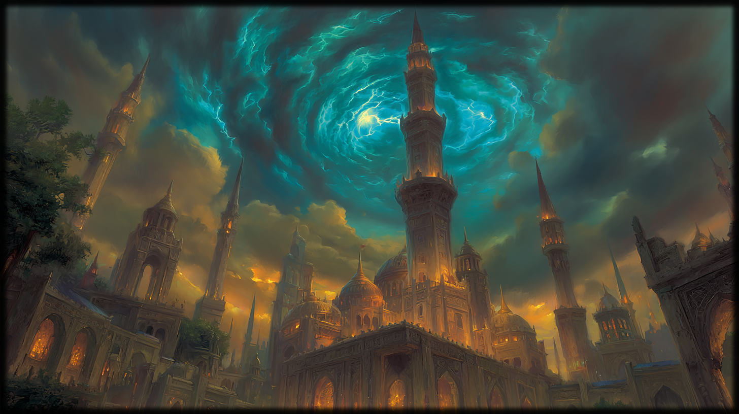 The Shal’Azuran temple of the Storm Lord, poised at the heart of Amana district, was not merely a sanctuary; it was a testament to the grand ambitions and engineered majesty of those who worshiped Kord. Its foundation was hewn from a rare, teal-veined marble quarried from the valley floor centuries past, but as the city ascended, so too did the shrine, growing skyward with every generation of faithful. Today, it loomed over the Grand Bazaar as an Olympian spear of colonnades and tiered buttresses, each level ringed with obsidian glyphs that shimmered and spat electric blue motes at dusk. The spire, itself an architectural act of defiance, was rumored to be the tallest in the city—taller, even, than the domes of Warda, though only the most irreverent would dare say so aloud.