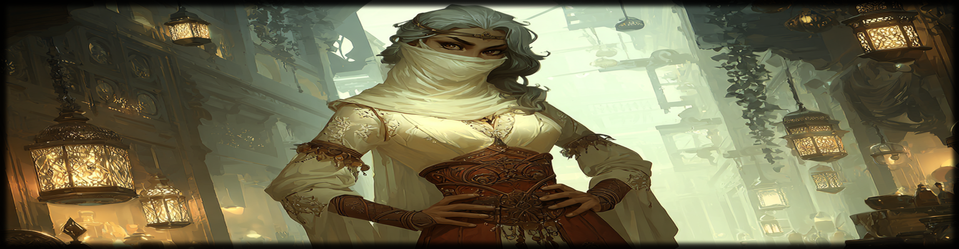 A slender woman draped in a cream colored silk gown, embroidered with thread of deep crimson and gold, her silhouette accentuated by a tightly wrapped sash at her narrow waist. Layers of gossamer-thin white scarves wind around her head and across the lower half of her face, revealing only a pair of watchful amber eyes that seem to catch every movement in the room. She carries herself with the straight-backed poise of nobility, her chin lifted slightly, fingers resting lightly at her sides as if prepared to reach for something hidden among the folds of her garments at a moment's notice.