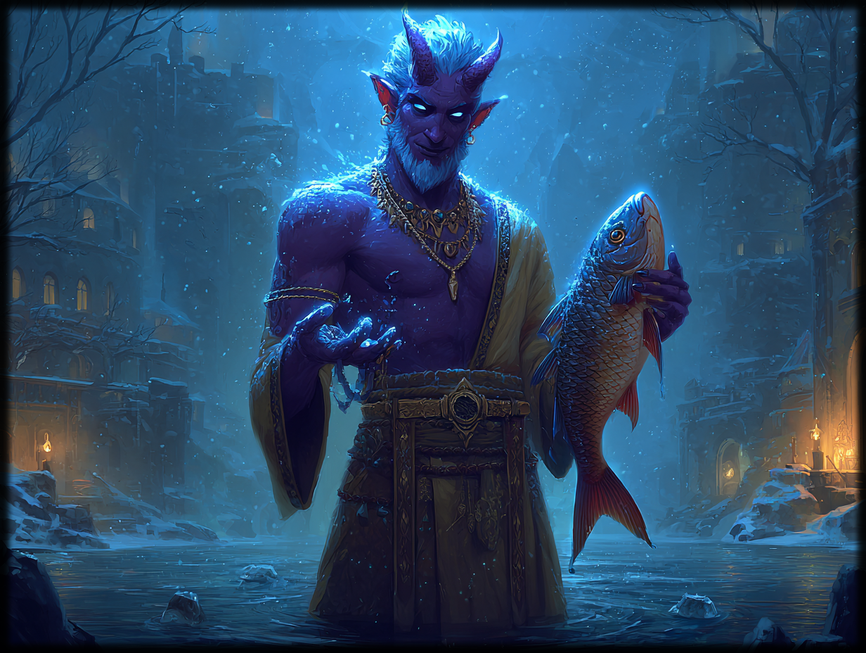 The carp, for its part, had not forgotten its old master. Wherever Ibn Al-Hadibi appeared, the creature would rise from mist-veiled waters, scales glistening with pale blue and silver, and hover at a respectful distance. Sometimes, on nights when the djinni’s heartbeat slowed and the moon dipped low, he would extend a hand of glassy ice, and the carp would rest its head there, exchanging silent confessions. It was the only living thing in all of Shal’Azura he could confide into.