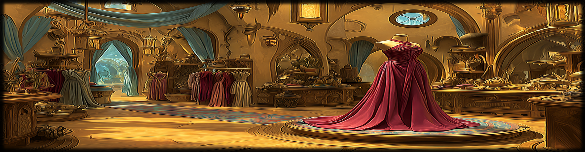Type: Cloth & Glamour Shop   Details: Exotic silks that shimmer like moonlight, carpets that can levitate, and scarves that conceal the wearer in shifting illusions. The tailor swears each bolt of fabric is woven from dreamstuff.