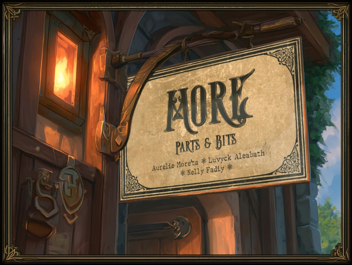 MORE - Parts & Bits is one of several shops in Makira, nestled snugly between other storefronts and easy to miss. This unassuming shop, however, is much more than a simple retail outlet for everyday gadgets; it serves as a spare parts emporium, a repair hub, an inventor's lab, and the residence of its three proprietors: Aurelie More'ta, Luvyck Aleabath, and Nelly Fadiy.