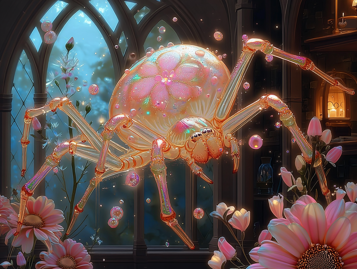Oldest of the three Faelight Haven Spiders, Tissera carries herself with the calm grace of a weaver who has seen countless dawns and dusks. Though she is only three days older than her sisters, she is regarded as their "Grand Mistress" — the one who sets the foundation upon which all others build. Her threads shimmer like the sky at sunrise, a shifting play of soft rose, peach, and lavender that changes with the light. Every strand she spins holds quiet strength, imbued with protective wards — her webs are durable, protective, and always laced with a subtle magic of comfort and safety.