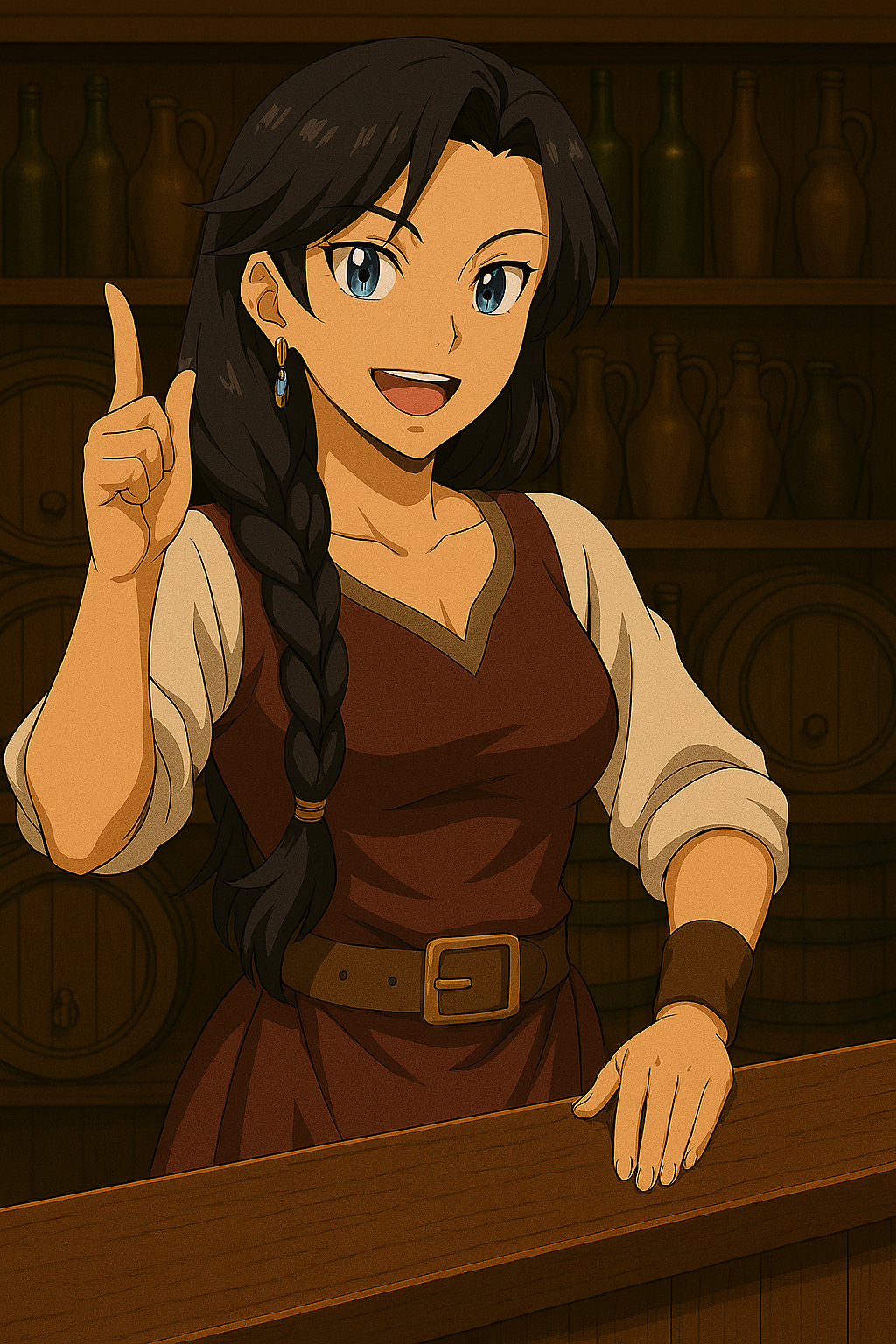The proprietor of The Wren & Willow, Branna Wren, is the kind of woman who could charm a dragon out of its hoard with a well-placed wink and a tale half-whispered over mulled wine. Though middle-aged, she moves with the grace of someone who’s danced on desert sands and scaled frostbitten peaks—her athletic frame still quick to vault a bar counter or spin a tale with theatrical flair. Long raven-black hair tumbles down her back in a loose braid threaded with charms from far-off lands, and her bright blue eyes sparkle with mischief, memory, and the kind of warmth that makes even the weariest traveler feel seen. She’s flirty in the way that makes people blush and laugh, never cruel, always playful—her affection as generous as her storytelling.