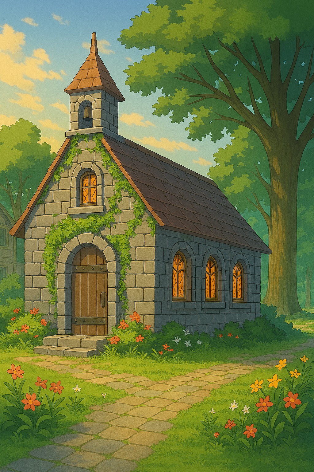 Near the center of Larkfen Hollow stands a modest yet enduring stone chapel nestled beside the village green, just steps from the town square and the ancient Whispering Oak. Its weathered façade and ivy-draped walls blend seamlessly with the surrounding cobblestone paths and flowerbeds, making it a natural gathering point for festivals, blessings, and quiet reflection. Inside, the air is warm with the scent of beeswax and dried rosemary, and carved wooden effigies of the old gods—guardians of hearth, harvest, and home—watch over the altar with serene grace.