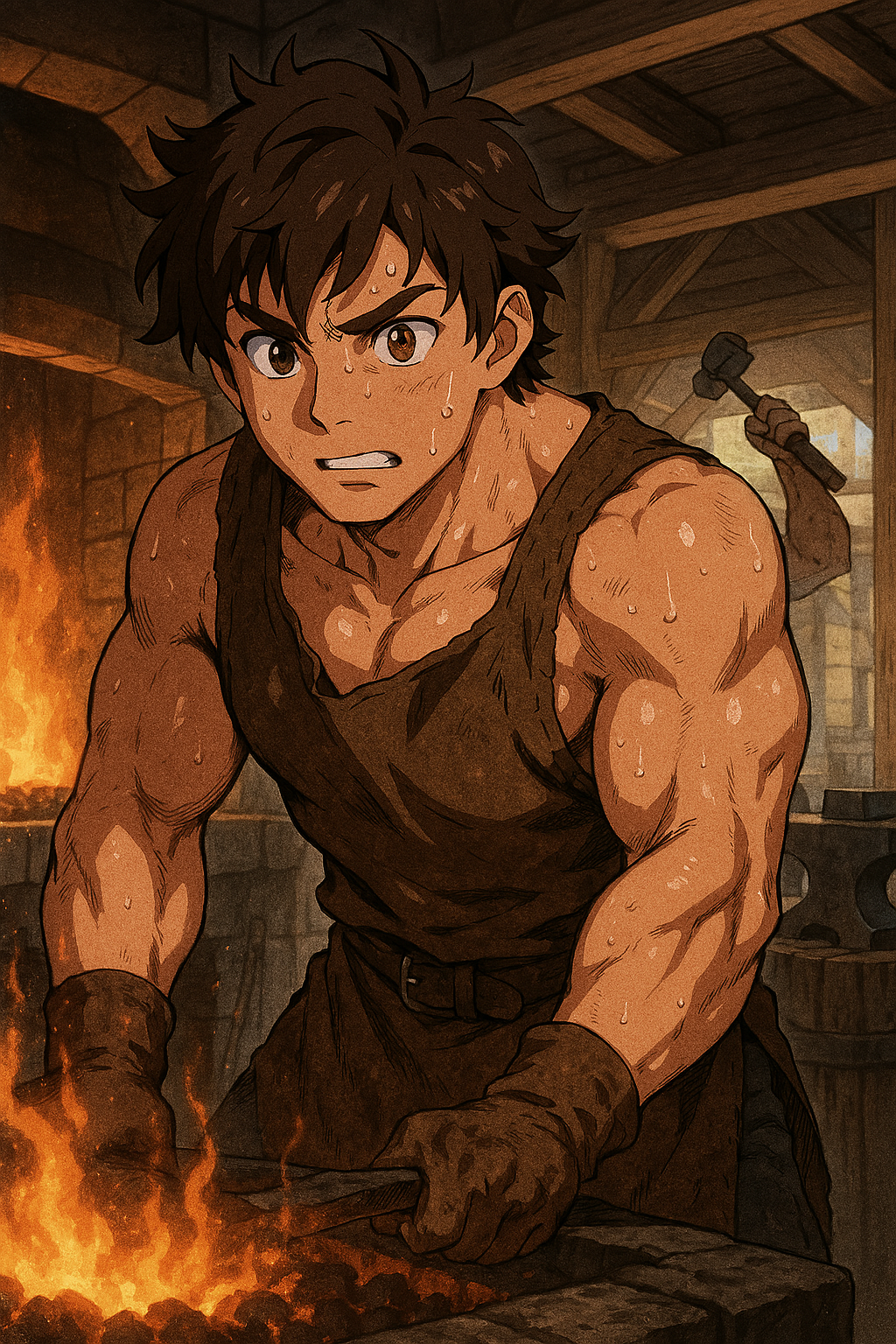 Serel Haywood is a disciplined blacksmith’s apprentice, known for his quiet focus and graceful movements around the forge. He treats his craft with reverence and though he tries to maintain a stoic front, Serel is easily flustered by Elysiaera's playful antics—especially when she hides his tools with a mischievous giggle. Beneath his reserved exterior lies a sentimental heart; he treasures small moments and mementos, even if he’d never admit it aloud. Her presence unsettles his routine, but he wouldn’t trade it for anything.