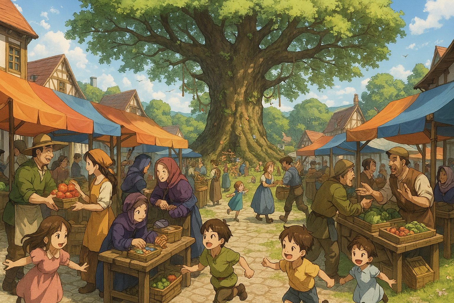 At the center stands the The Whispering Oak, ancient and revered, its moss-covered, silver-veined bark adorned with offerings—acorns, ribbons, and folded notes tucked gently among its roots. Locals pause to whisper hopes into the breeze, believing the tree listens. Nearby, Mother Nettle, a sharp-eyed crone with a voice like rustling leaves, sells enchanted thread that reacts to emotion and memory. She asks no coin—only secrets, songs, or tears. In this place, trade is more than commerce; it’s connection, tradition, and the quiet magic of a community that knows how to listen, share, and celebrate the everyday wonder of being together.